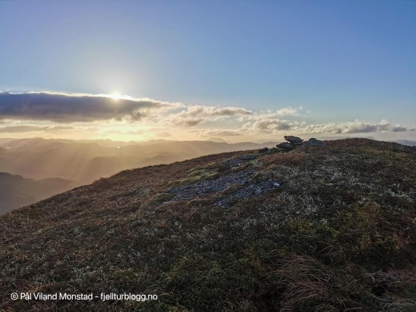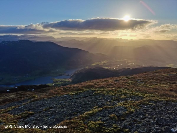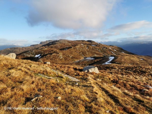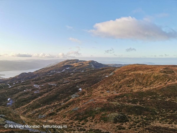 På hele turen hadde vi flott utsikt mot Skåneviksfjorden/Kvinnherad/ Sunnhordland i nord, og dalføret innover mot Stordalen i sør. I øst var Håfjellet en markant topp. Lett å plassere kjente fjelltopper med klare snøskiller. Ulvanosi i nord, Siggjo langt i vest og Hustveitsåta i sør, for å nevne noen få.