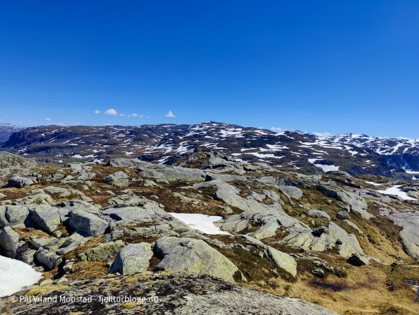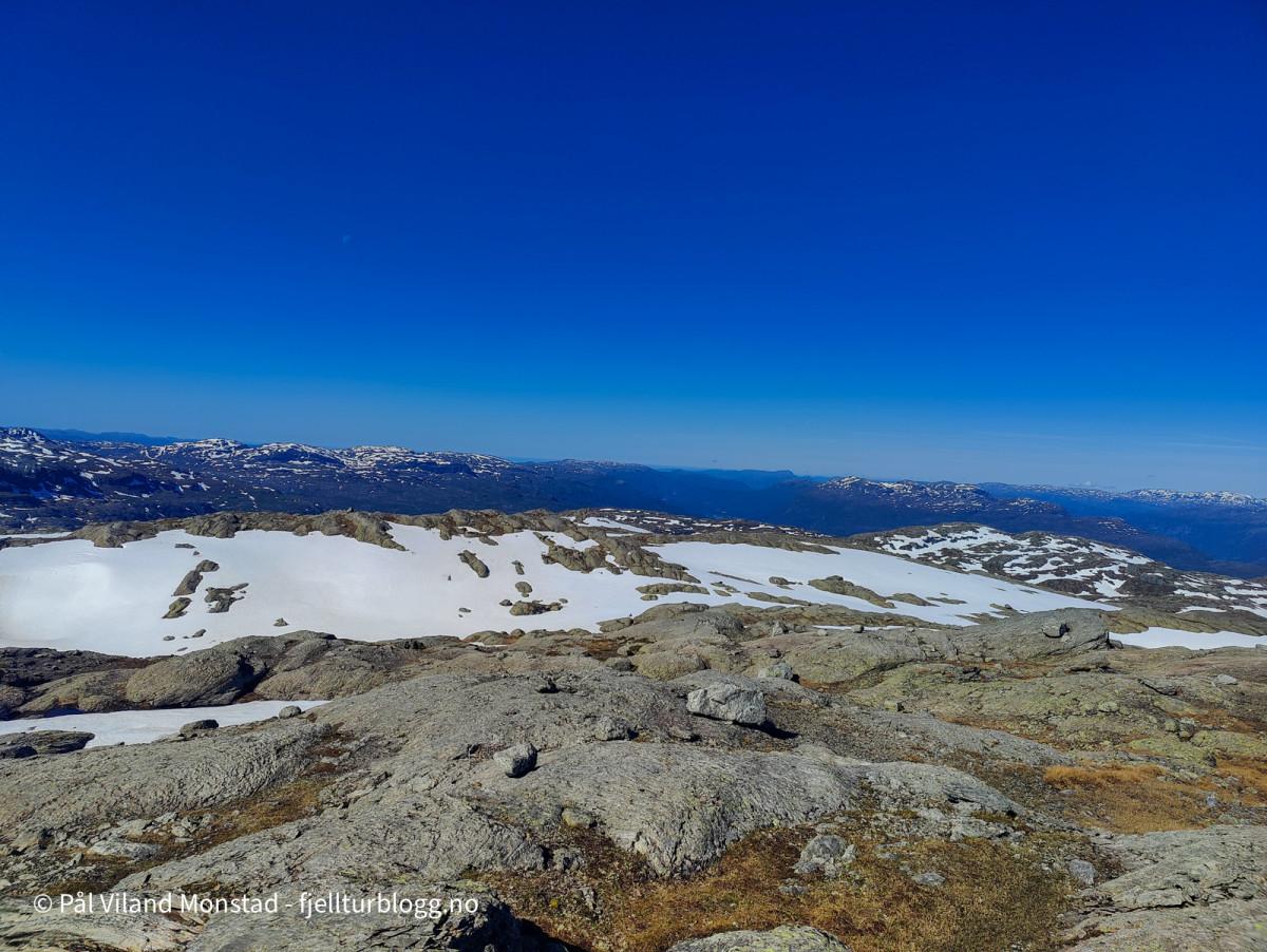 Vestre Kaldefjell var også lett å bestige. Fint og flatt topplatå. Framme ved varden på 1449 moh var utsikten helt fantastisk. Klarværet gjorde at jeg kunne se helt til Gaustatoppen i øst. I nord Skaulen og Folgefonna. Nærmere i øst Snønuten og Kringlenuten. I vest Såta.