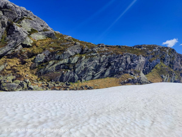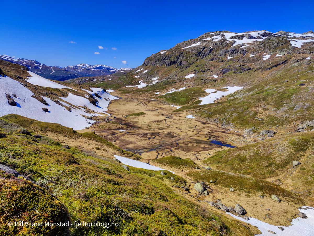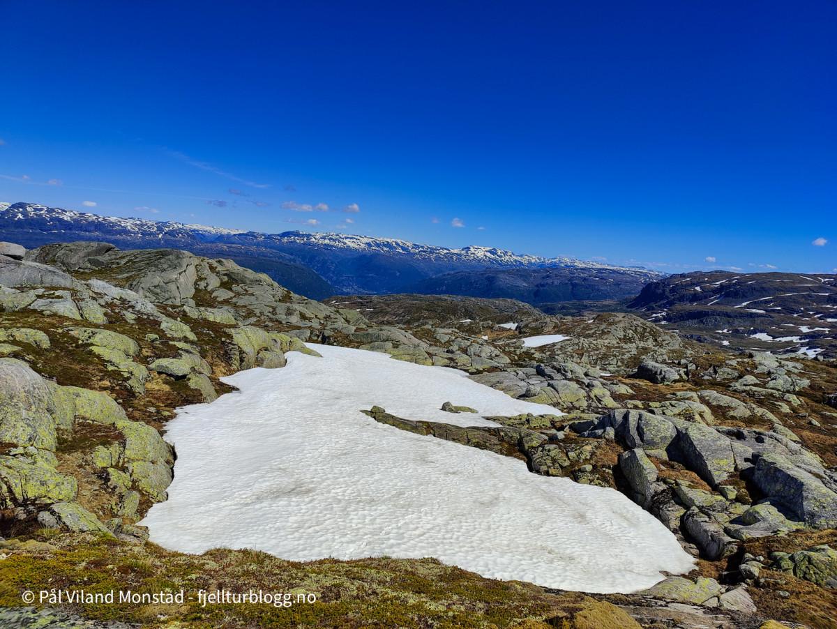 Jeg kom meg greit ned fra platået, og fortsatte turen over mer eller mindre sammenhengende snøfonn vestover mot Botnanuten 1273 moh. Mindre snø etter som jeg kom noe lavere og lenger vest. På veien tok jeg en lenger pause i det flotte været.