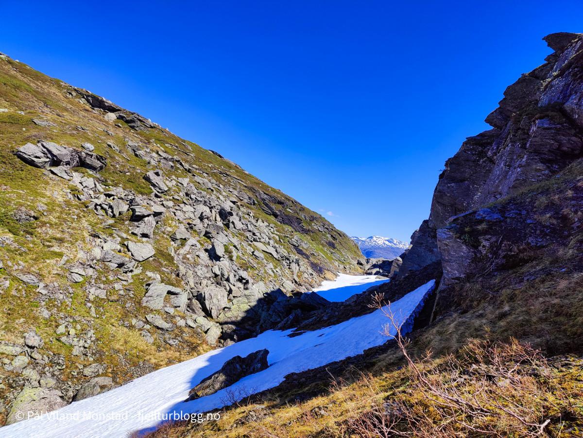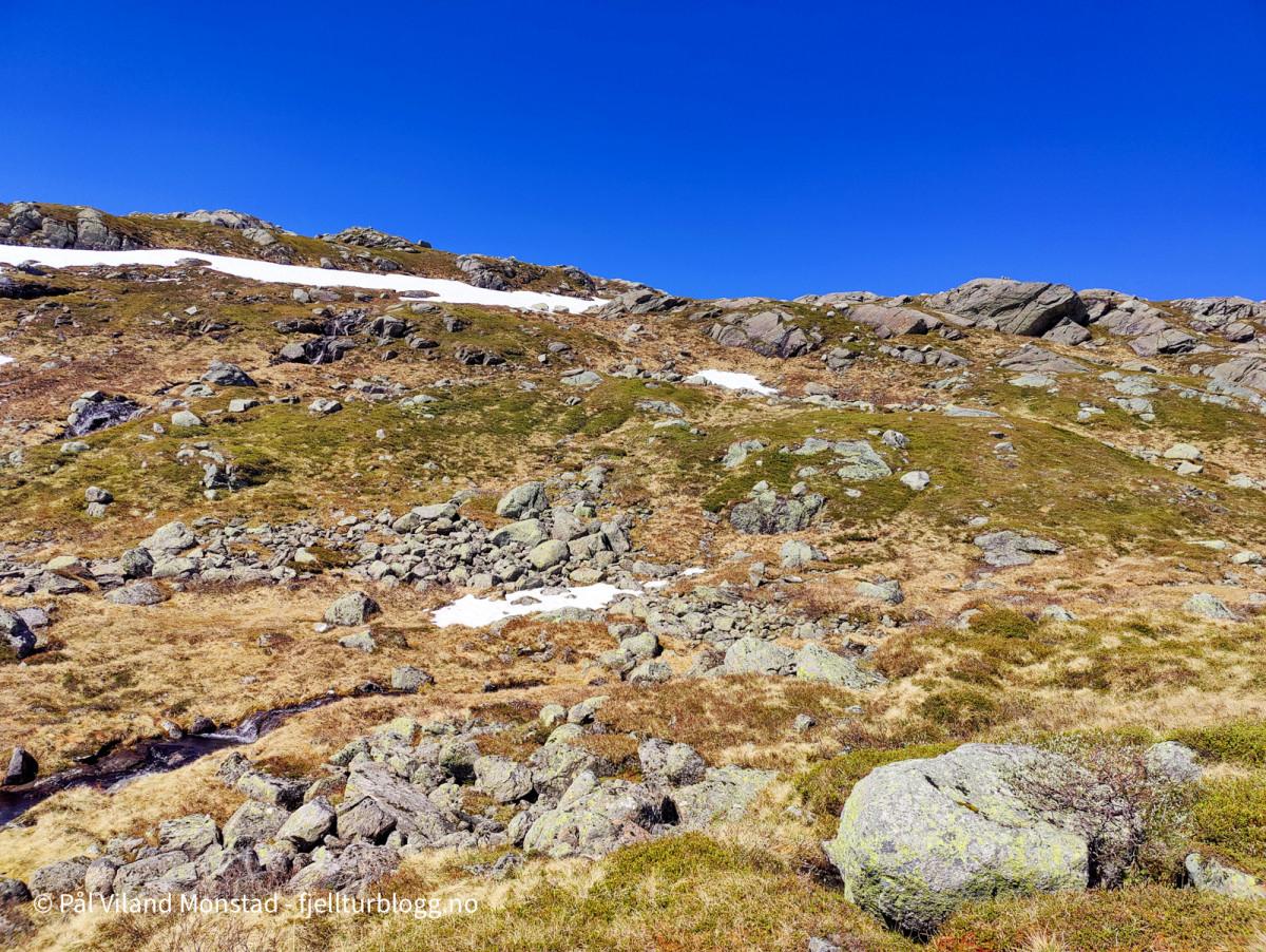 Videre nedover mot Dyrskar var det fortsatt noen fonner. Vel nede i skaret var det bare å forberede seg på ny stigning. Ikke fullt så bratt som ned fra Botnanuten. Ikke like mange snøfonner her i sørhellingen som det hadde vært i nordhellingen på andre siden av dalen. Etter en del høydemeter kom jeg til større fonner, med ferske fotspor. Et stykke fra toppen kunne jeg til og med se folk. Det er ikke hverdagskost å treffe folk på mine toppturer.