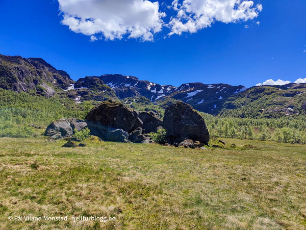 Bilen ble parkert ved Nyastølen i enden av Lauvastølsvatnet, innenfor Saurdal i Suldal. Her gikk turen først på grusvei opp Nyastølsjuvet, før det gikk over til god sti innover Kvilldalsdalen. På veien passerte jeg flere støler. I vinter var jeg på skitur innover her, til Botnanuten. Les mer om den turen her.