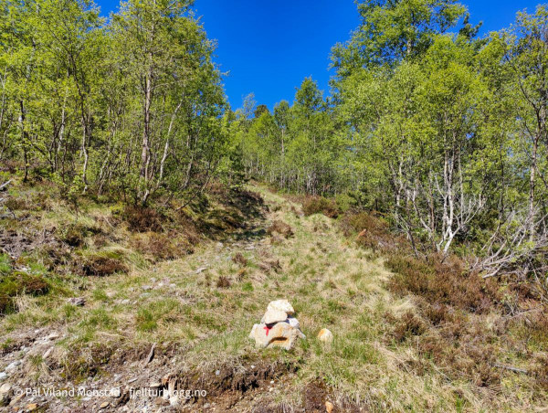 Etter litt heft gjennom noen grinder og over noen bruer, kunne turen starte på tydelig T-merket sti oppover skogen. Omtrent oppe ved høystentmastene forlot jeg stien til fordel for en nødla rute som så ut til å gå i riktig retning. Det var tett mellom nødlingene og lett å følge. Etter et godt stykke og en del høydemeter forsvant plutselig nødlingene, og jeg måtte navigere videre på egenhånd. Det ble litt baksing i lav fjellbjørkeskog, og noe småkupert terreng, før det flatet noe mer ut innover mot inngangen til Bukvelven. Her kom jeg igjen inn på en tydelig sti, men uten nødlinger. Det ble en pause ved et lite bergutspring hvor det helt tydelig har vært folk og rastet tidligere. To heller var satt opp for å lage to ryggstø i solhellingen.