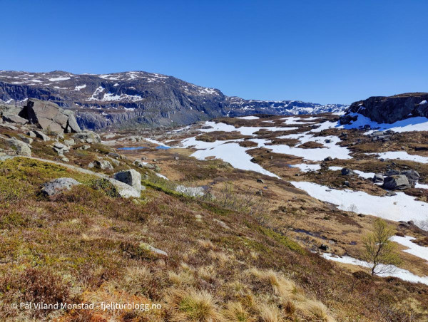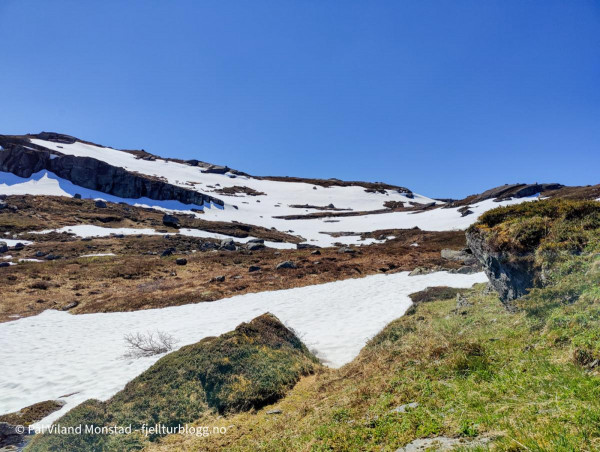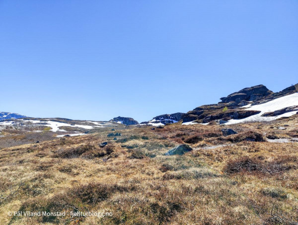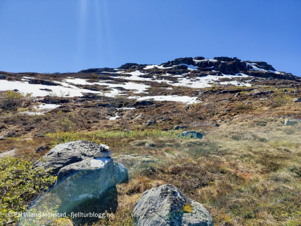 Jeg fortsatte i nordhellingen, slik at jeg kom opp på vestsiden av Bukvelven. Fra vestsiden gikk jeg sørlig og endte ved et delvis islagt vann som ikke var forsvarlig å gå over. Det ble derfor en liten omvei rundt på østsiden av vannet. Derfra videre i sørvestlig retning mot toppen. Toppen hadde ingen varde, men GPSen viste at jeg var på det høyeste punktet, 995 moh. Herfra var det utsikt til en flott varde lenger sørvest.