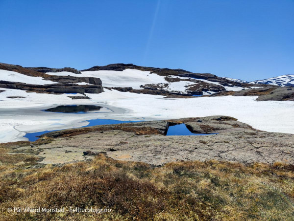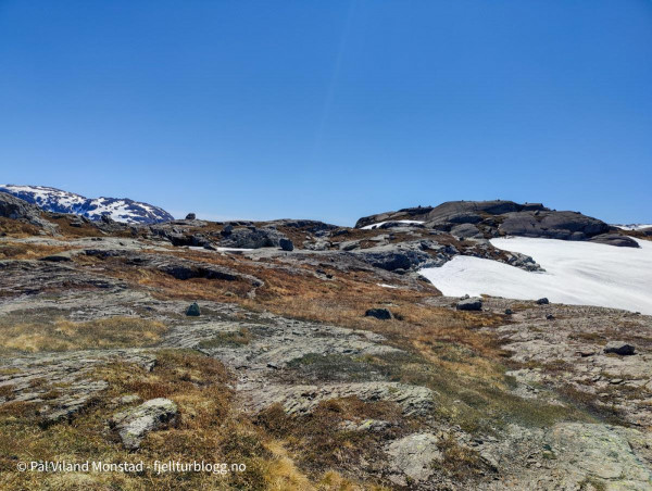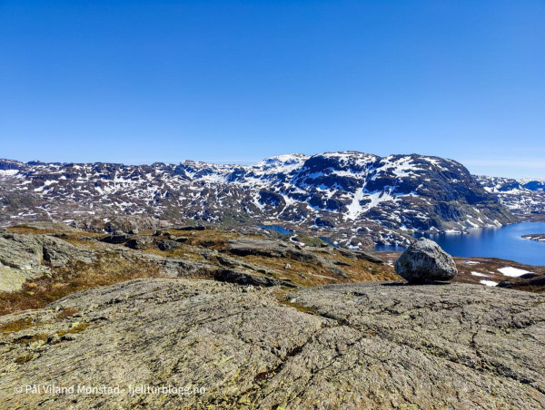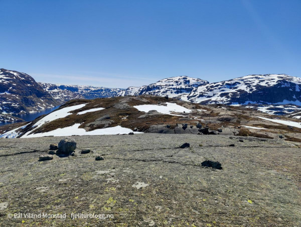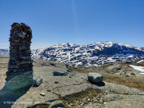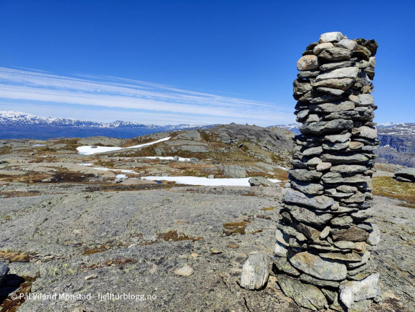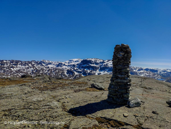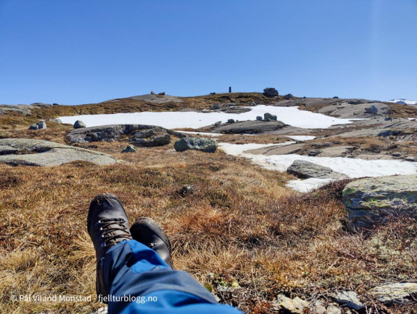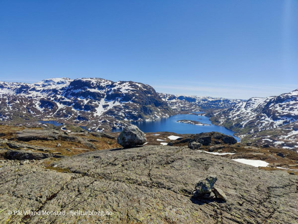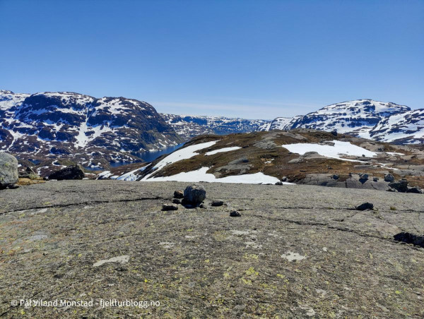 Vel framme ved varden var det fin utsikt mot Svinstølvatnet og omkringliggende topper. Etter en liten pause ved varden gikk jeg et stykke tilbake for å komme i le av en liten trekk. En fantastisk dag i høyfjellet gjør at man ikke trenger å haste avgårde. Hele turen gikk derfor i bedagelig tempo med mange pauser og stopp.