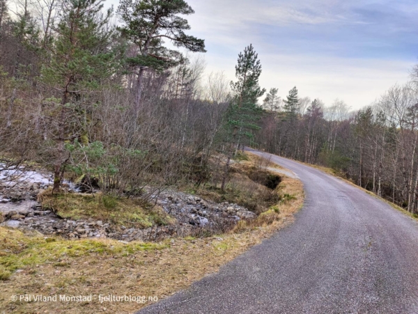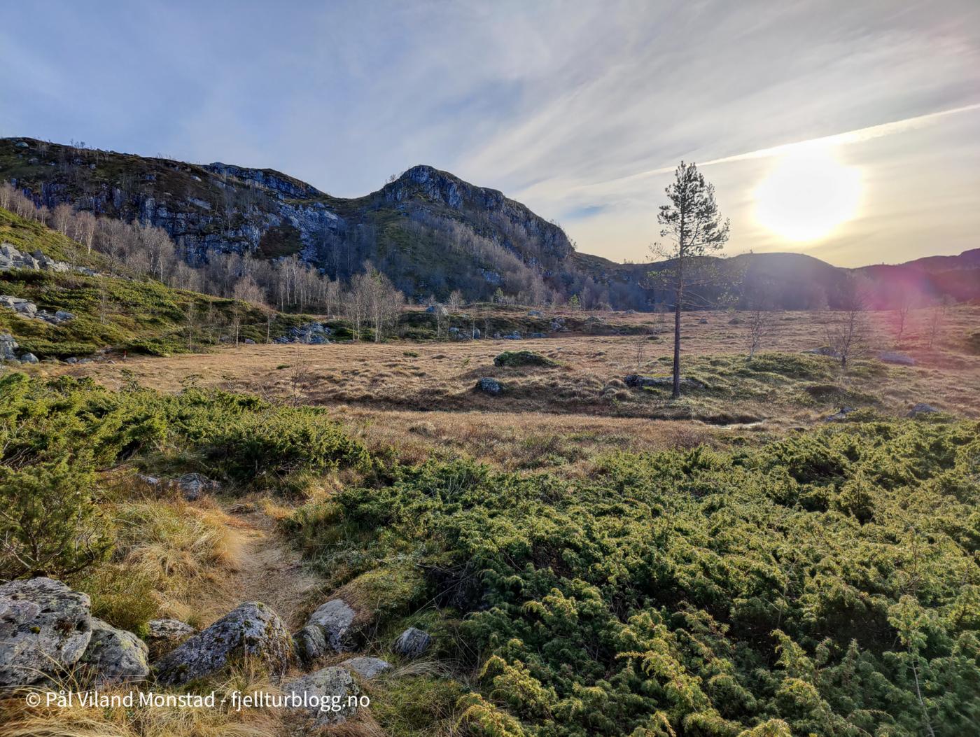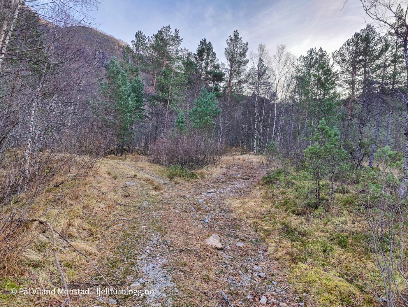 Etter tur til Skipet og Helgelandsåsen kjørte jeg til Trædet, hvor det var stor parkeringplass og merket startpunkt for tur til Kleppsnuten. Stien startet på kort skogsvei rett over elva ved parkeringsplassen. Etter kort tid gikk veien over til tydelig og godt merket sti.