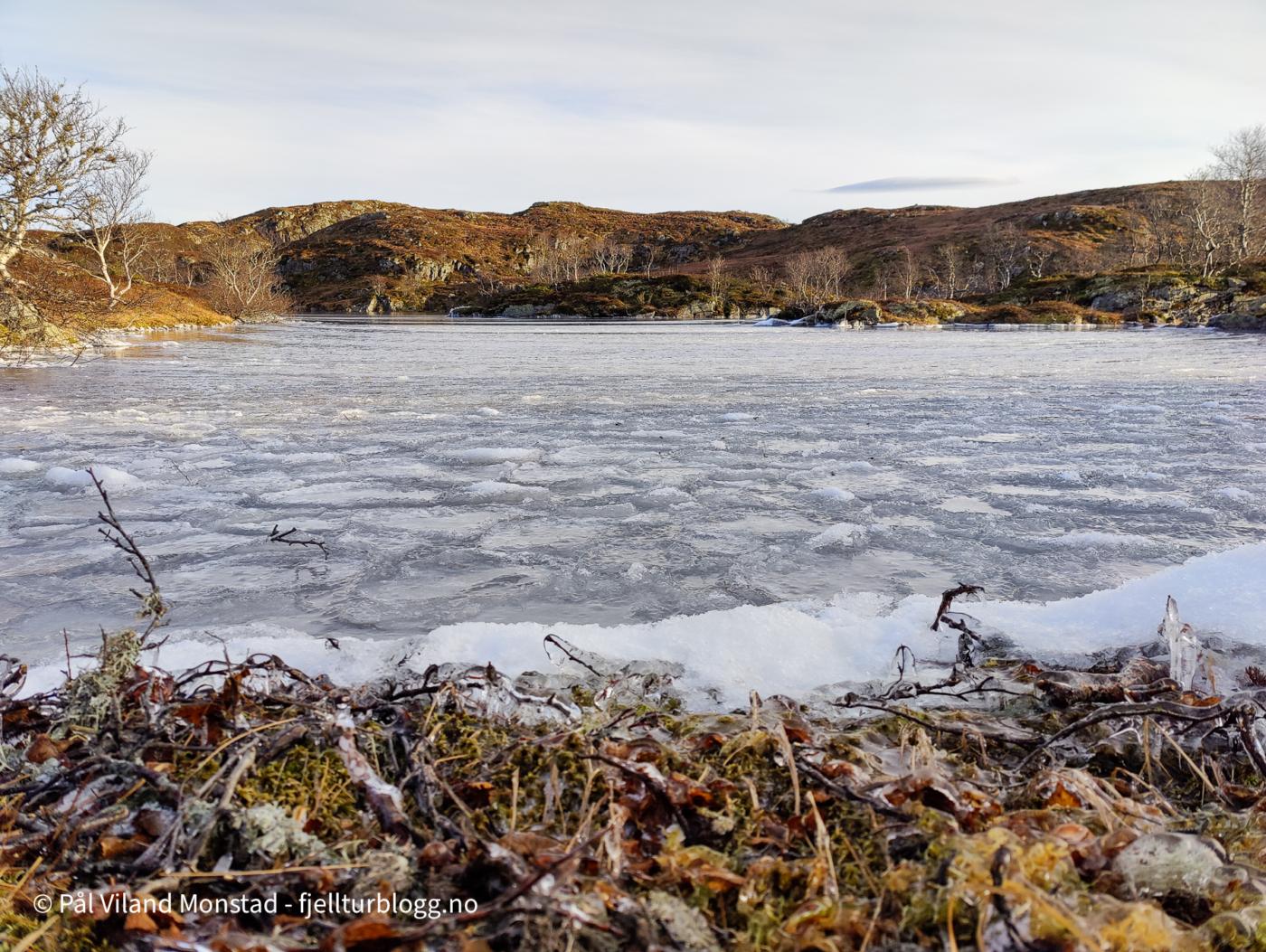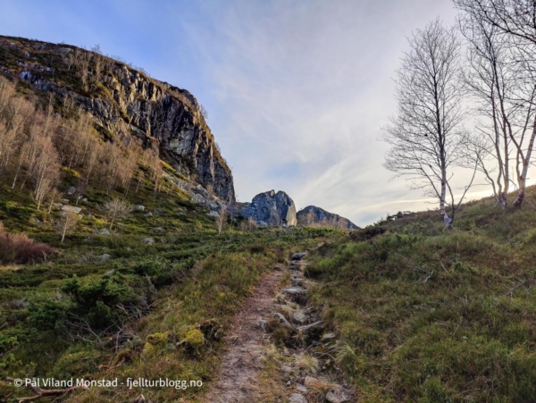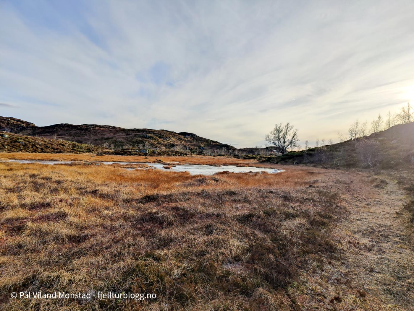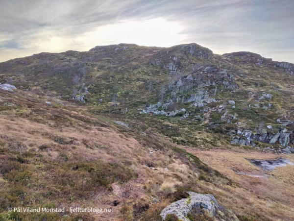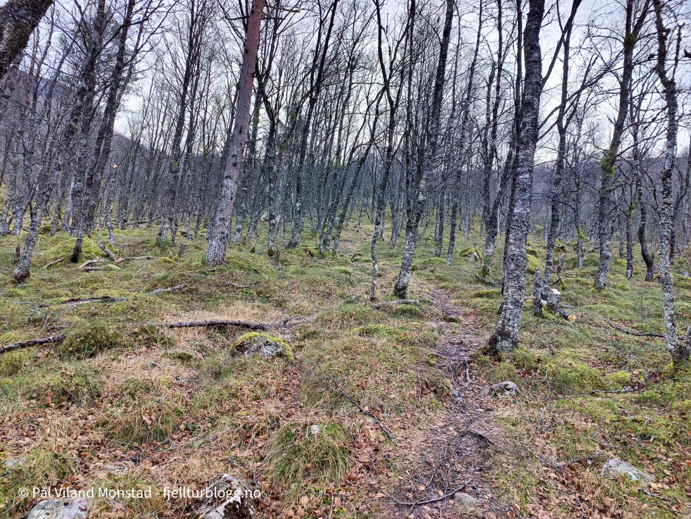 Først et parti med god stigning gjennom bjørkeskogen, før vegetasjon og stigning avtok. Det var svært lettgått innover mot Lomatjørna. Siste stykket opp til toppen var småbratt, men likevel lett å gå på stien. Vel oppe ble det et kort stopp i den iskalde vinden. Fin varde, og fin utsikt!