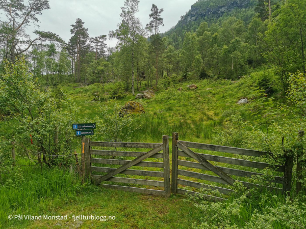 Jeg kom til ei grind med merket rute til Lølandsnuten, rett før nedstigningen mot Løland. Antok det ikke var stortrafikk på veien, så bilen ble parkert på veiskuldra, rett ved.