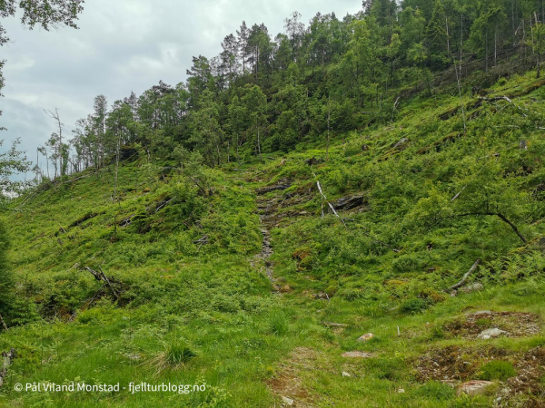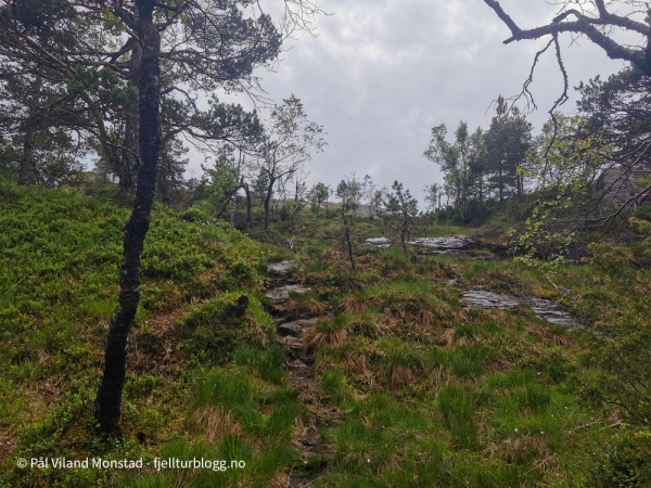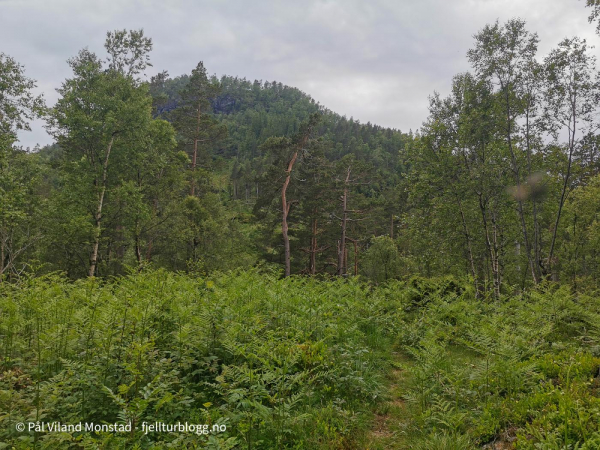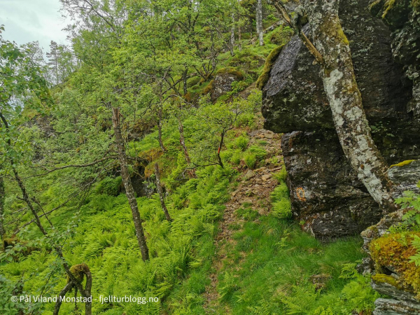 Hele turen gikk på tydelig sti i terrenget. Ikke så mye å skrive om. Følg stien, og du kommer til toppen! Fint og lettgått terreng opp gjennom skogen. Noen få bratte partier, ellers absolutt en fin tur for alle. Nærme toppen ble det mindre vegetasjon.