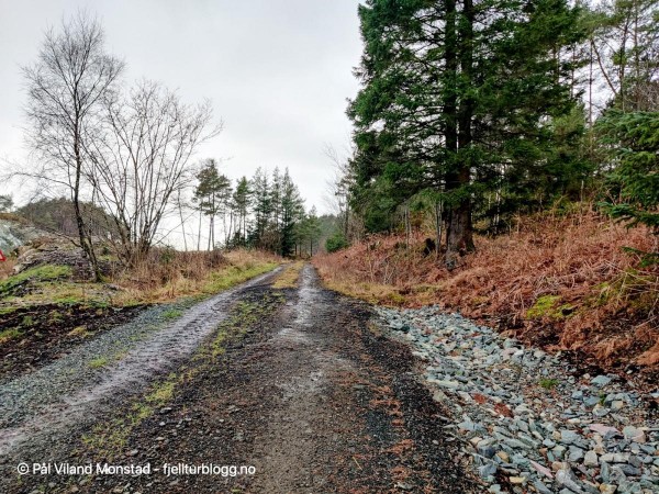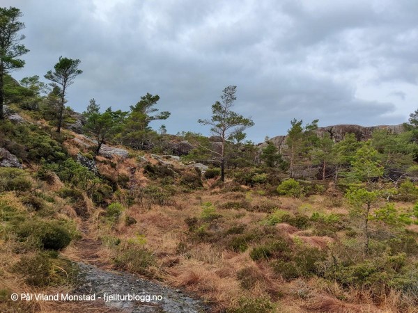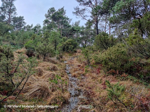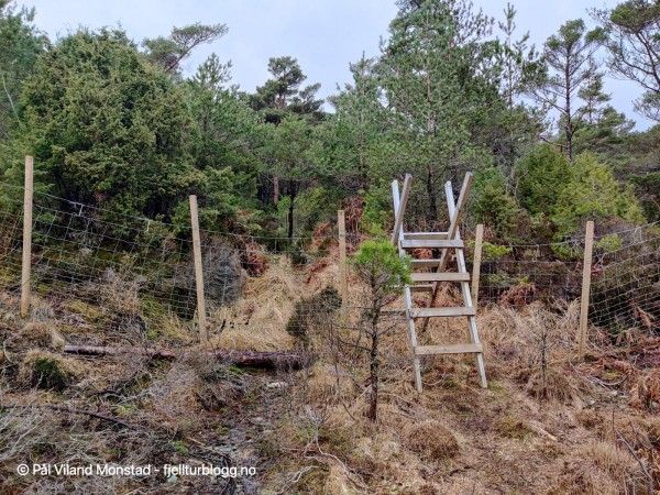 Bilen ble parkert omtrent i krysset mellom ny og gammel vei sør for Våge. Jeg fulgte merking mot Hovda, på traktorvei. Etter å ha passert sauer, med en skikkelig staselig vær som passet på, kom jeg til gjerdeklyver. På andre siden av gjerdet startet tydelig sti videre.