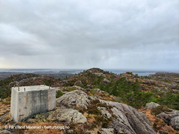 Ikke alle stikryss var like godt merket, og det var nødvendig med kart et par steder for å velge riktig retning. Det tok ikke mer en en knapp halvtime å komme til toppen, som tydeligvis har vært utstyrt med mast eller noe slikt tidligere. Bare fundamentet sto igjen på toppen som er 152 moh. Fra toppen var det fin utsikt. Sur vind gjorde derimot at besøket ble kortvarig. Jeg tok samme veien tilbake, og 45 minutter etter å ha forlatt bilen var jeg tilbake ved den.