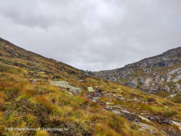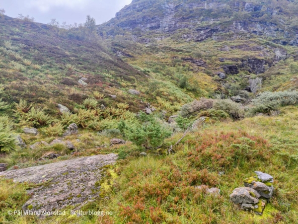 Rett etter Øvrestølen gikk jeg av stien der det var nødling på begge sider av bekken. Jeg mener å huske at bekken var rimelig stor på forrige tur, så det kan muligens være noe utfordrende å komme over i snøsmelting tidlig på sommeren. I dag var bekken derimot nesten tørr.
