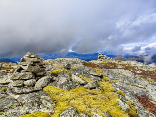 To mindre varder viste hvor toppen/det høyeste punktet var. Fin utsikt mot Hylsfjorden og toppene nord for den. På dagens tur drev det lavt skydekke forbi, så utsikten var noe begrenset.