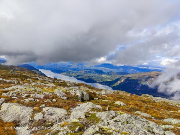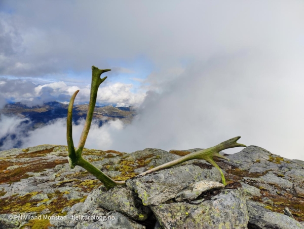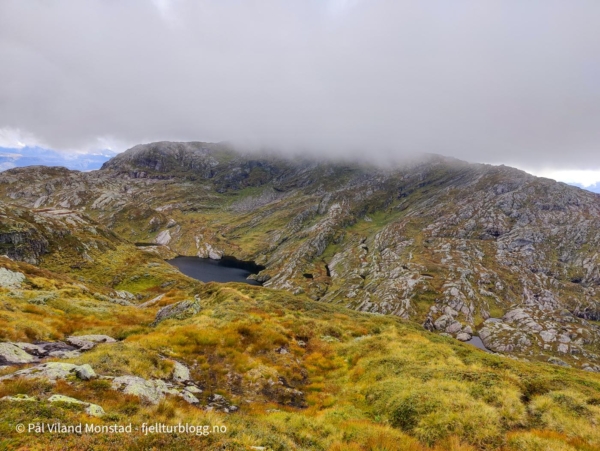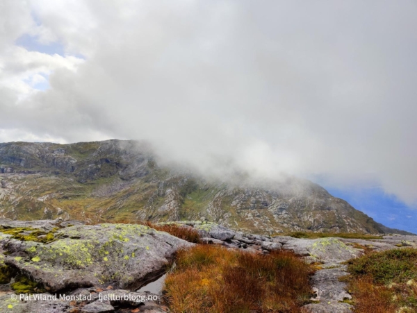 Ellers hadde jeg en fin opplevelse en stykke ned fra toppen på returen. Jeg hadde matpause, og plutselig kom ei svær ørn ut av skylaget. Den seilte forbi, flere ganger, før den på nytt forsvant inn i skyene.