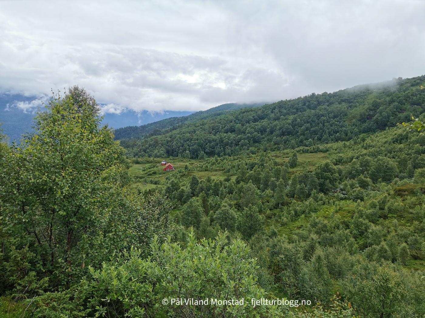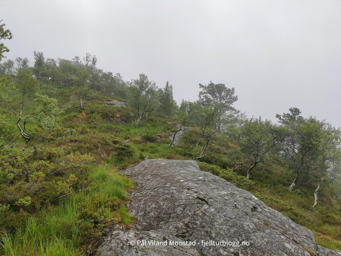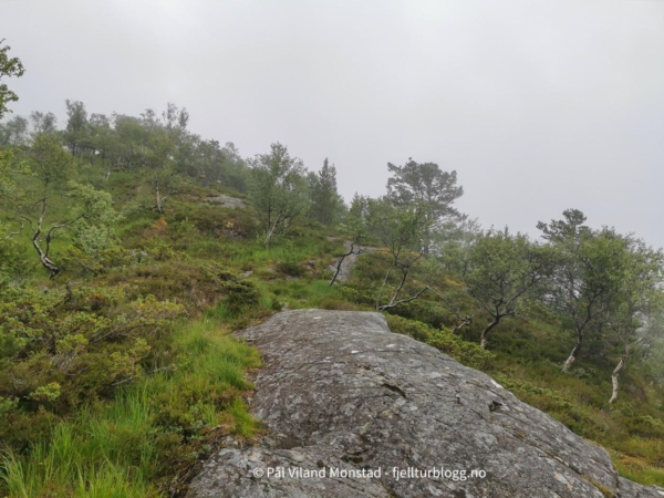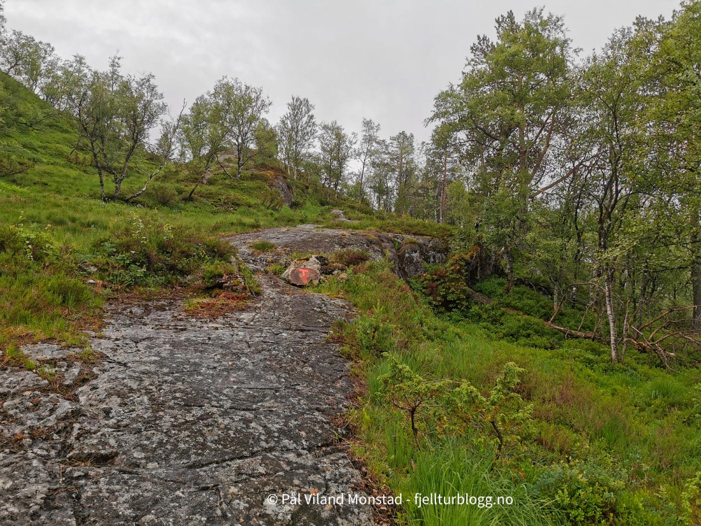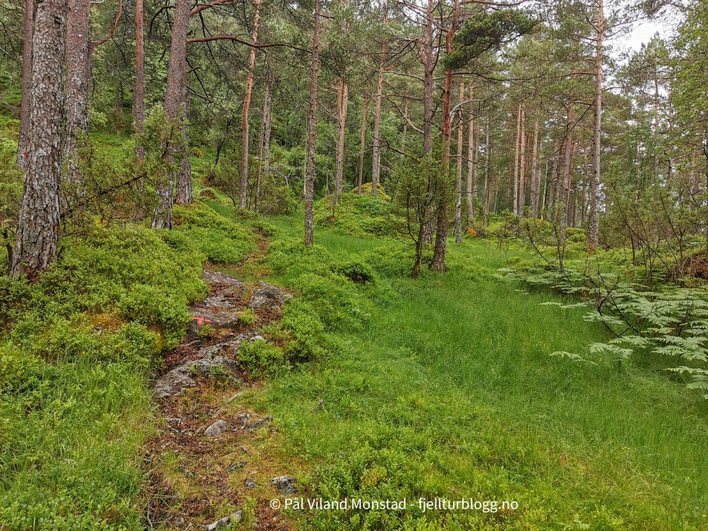 Den merka T-stien gikk gjennom gardstunet og videre opp gjennom skogen. Ikke så bratt som jeg hadde sett for meg, men selvsagt bratte kneiker. Vi skulle tross alt opp til over 1000 moh.