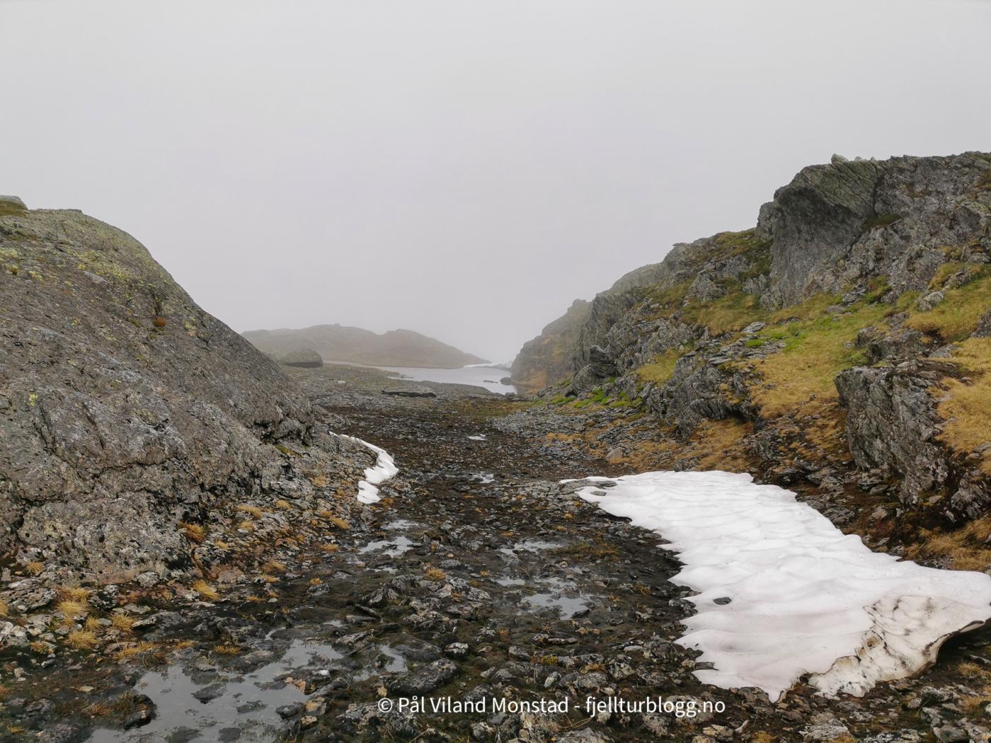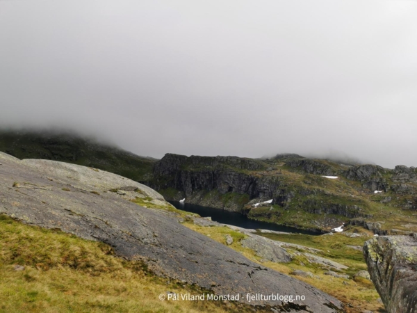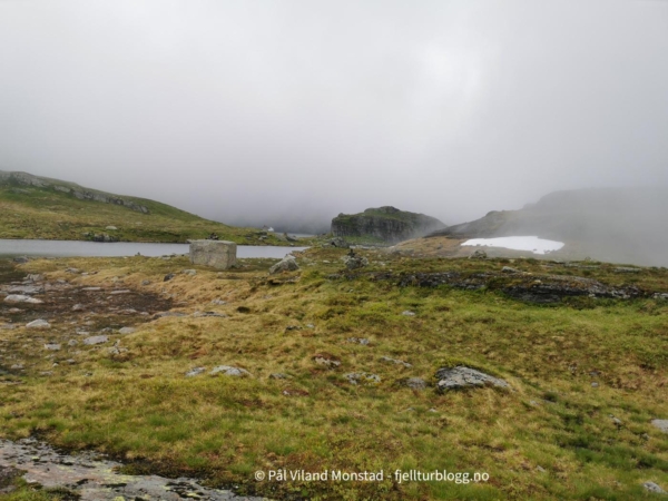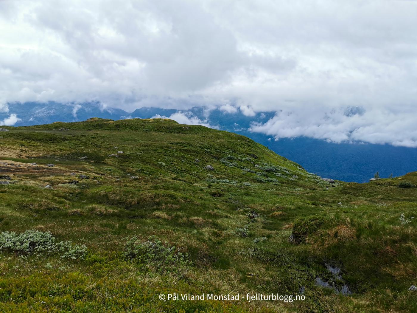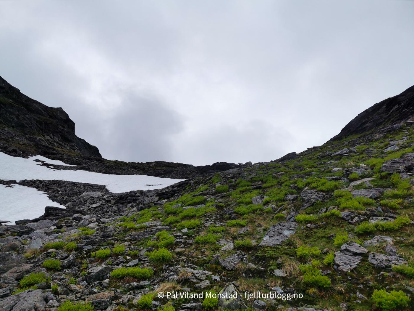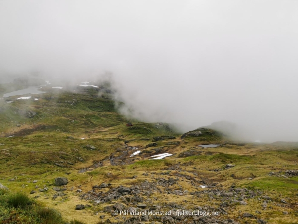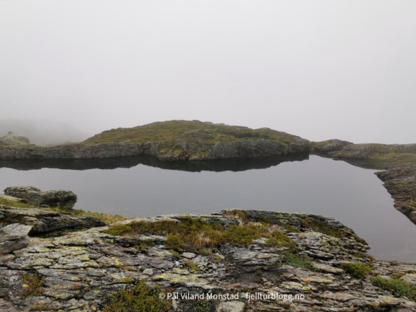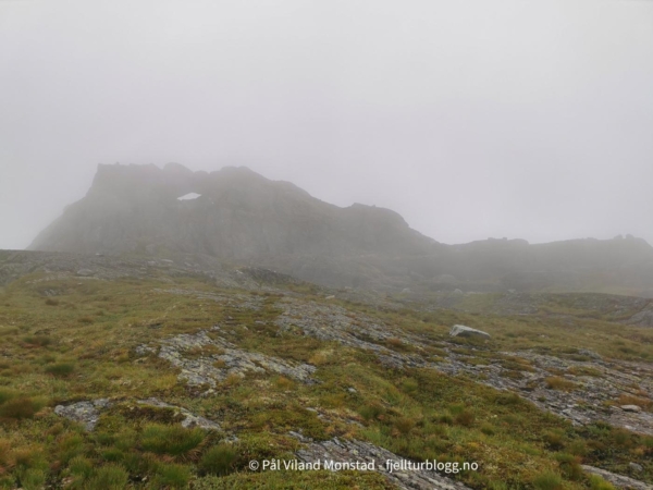 Vi gikk tilbake samme vei vi kom, tok på sekkene, og fortsatte opp motsatt side av skaret. Det gikk greit å komme opp til den mye mindre varden på toppen. Nedbøren vi hadde hatt med fra forrige topp gav seg, men ikke skydekket. Derfor ikke utsikt herfra heller.