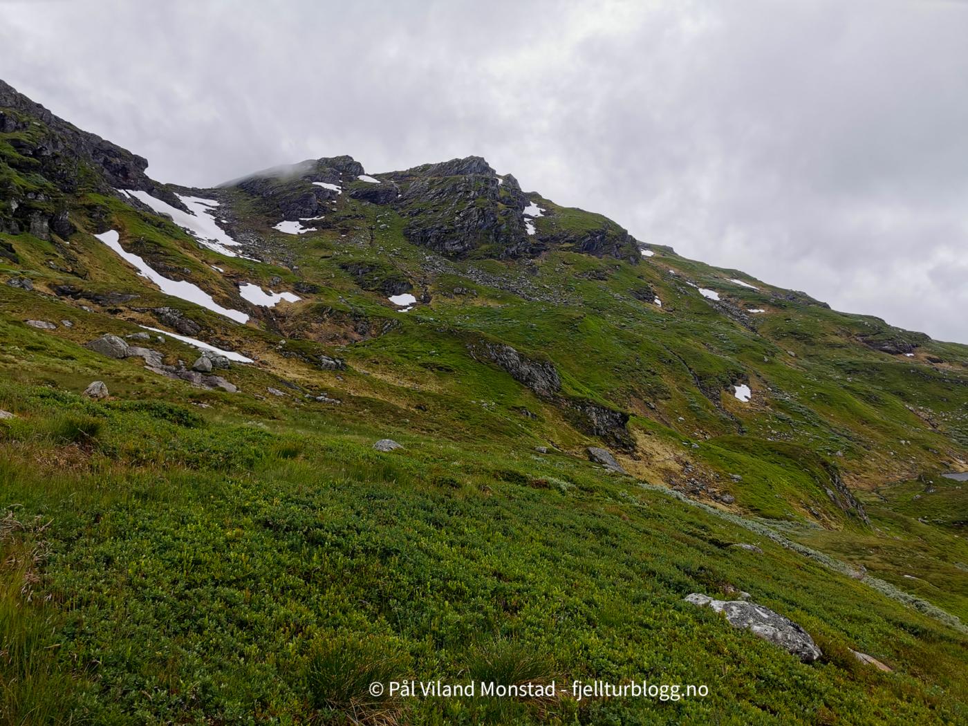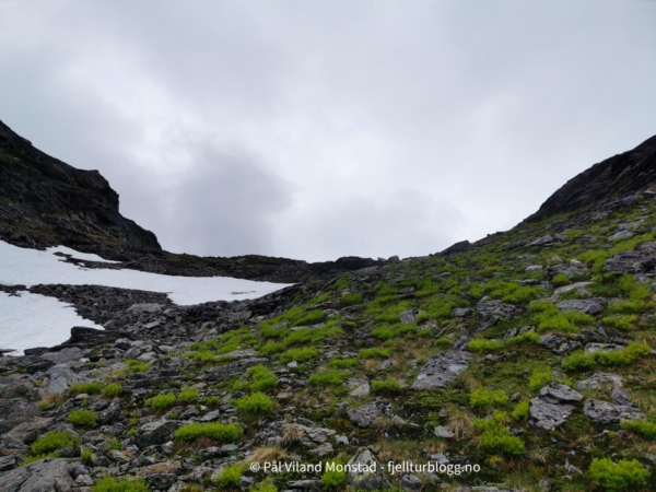 Møssegronuten 1135 moh var dagens første topp å bestige. På avstand så den noe utilgjengelig ut, men etter som høydemetrene ble tilbakelagt kom vi stadig nærmere. Vi måtte følge ei hylle ganske langt nord før vi fant egnet sted å komme opp til toppen. Her traff vi også enkelte nødlinger som viste vei.