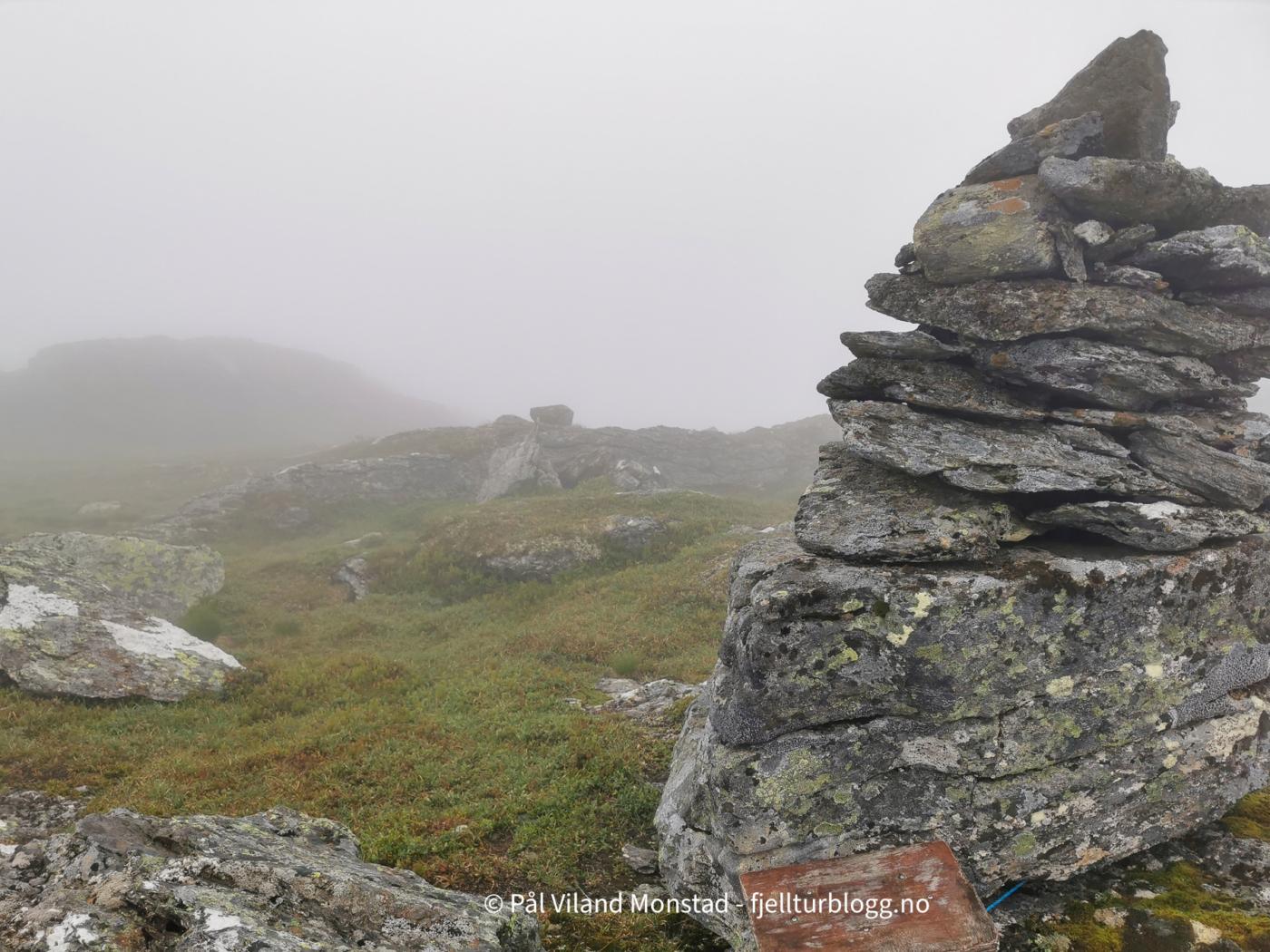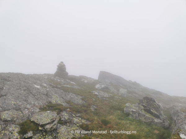 Vi holdt høyden stort sett helt bort til ura, før det gikk bratt opp siste stykket til toppen av skaret. Her tok vi av sekkene, og fulgte nødlinger videre mot toppen, som lå i skoddeheimen. Vi mistet nødlingene før toppen, men det var ikke vanskelig å finne fram. Varden var stor og flott. Det kan man derimot ikke si om dagens utsikt, som helt forsvant i skydekket.