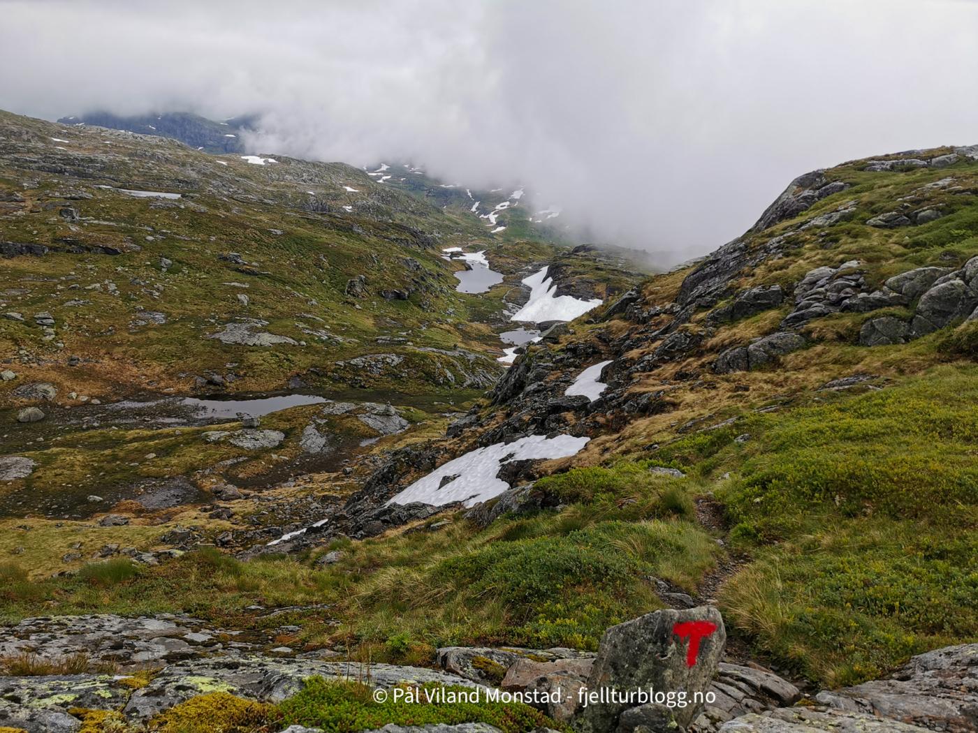 Fra toppen gikk vi nordøst, for vi dreide østlig. Ingen god ide, for vi kom til kanten av et stup. Godt synlig med en stor varde, men altså ingen veiviser for trygg nedfart. Vi måtte i mer nordvestlig retning før vi kom ned ei bratt fonn, og deretter kunne dreie østlig i retning stien som var inntegnet på kartet.