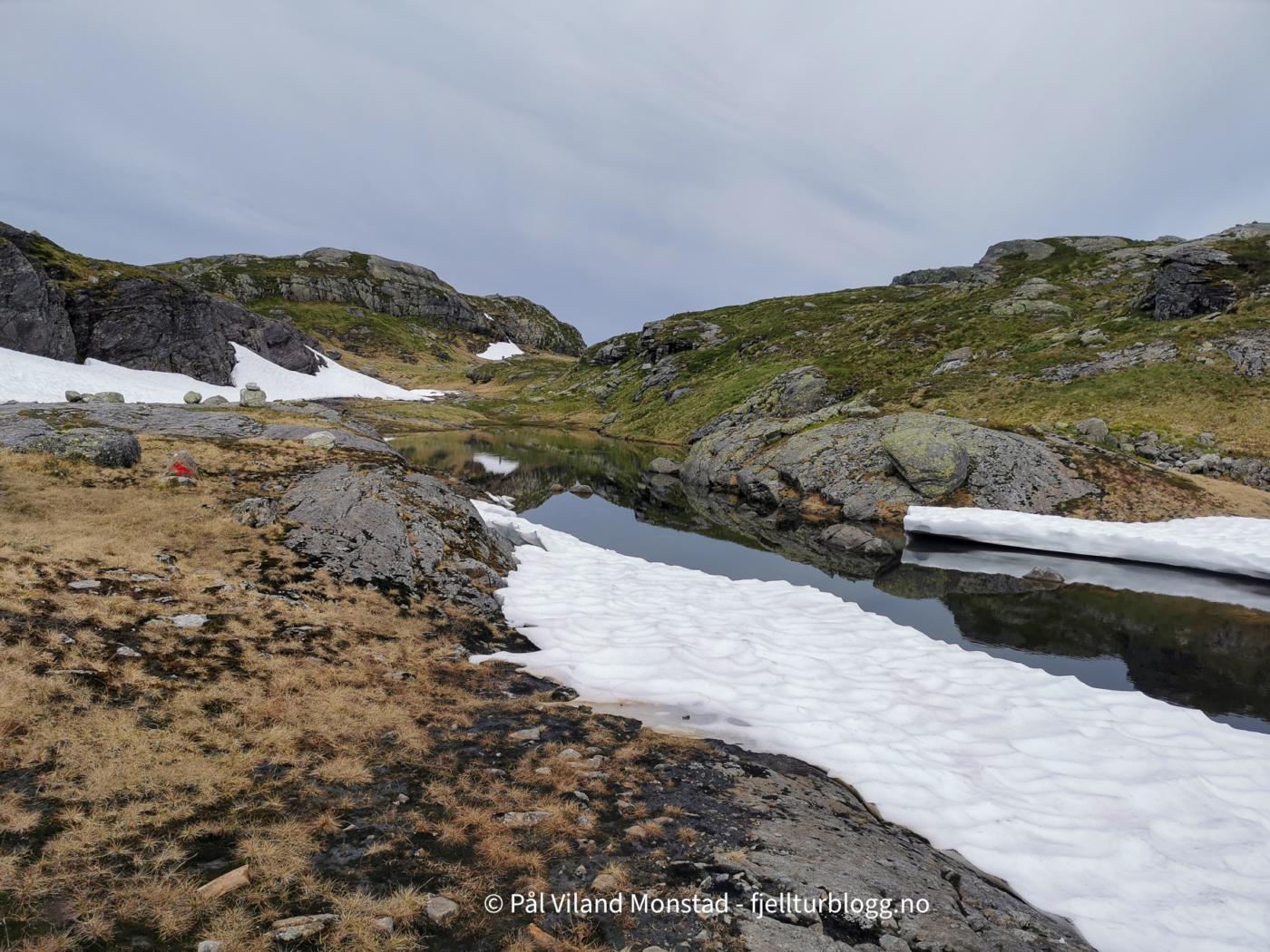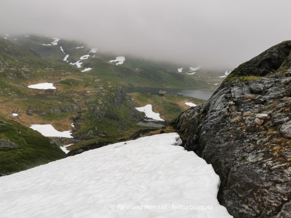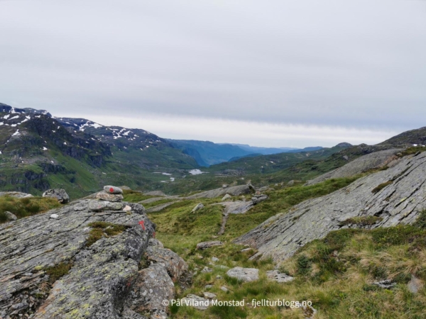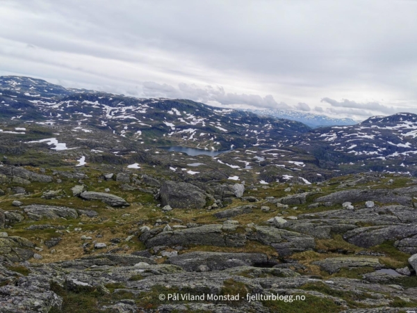 Vi gikk videre østover i retning T-stien som vi hadde fulgt tidligere på dagen. En stor varde viste hvor stien gikk. Vi fulgte stien i høydene på sørsiden av Nautavatnet. Etter hvert fikk vi øye på Sandvatnet og turisthytta, og det var bare å ta ned skaret i retning hytta.