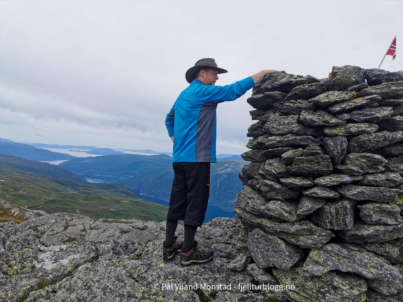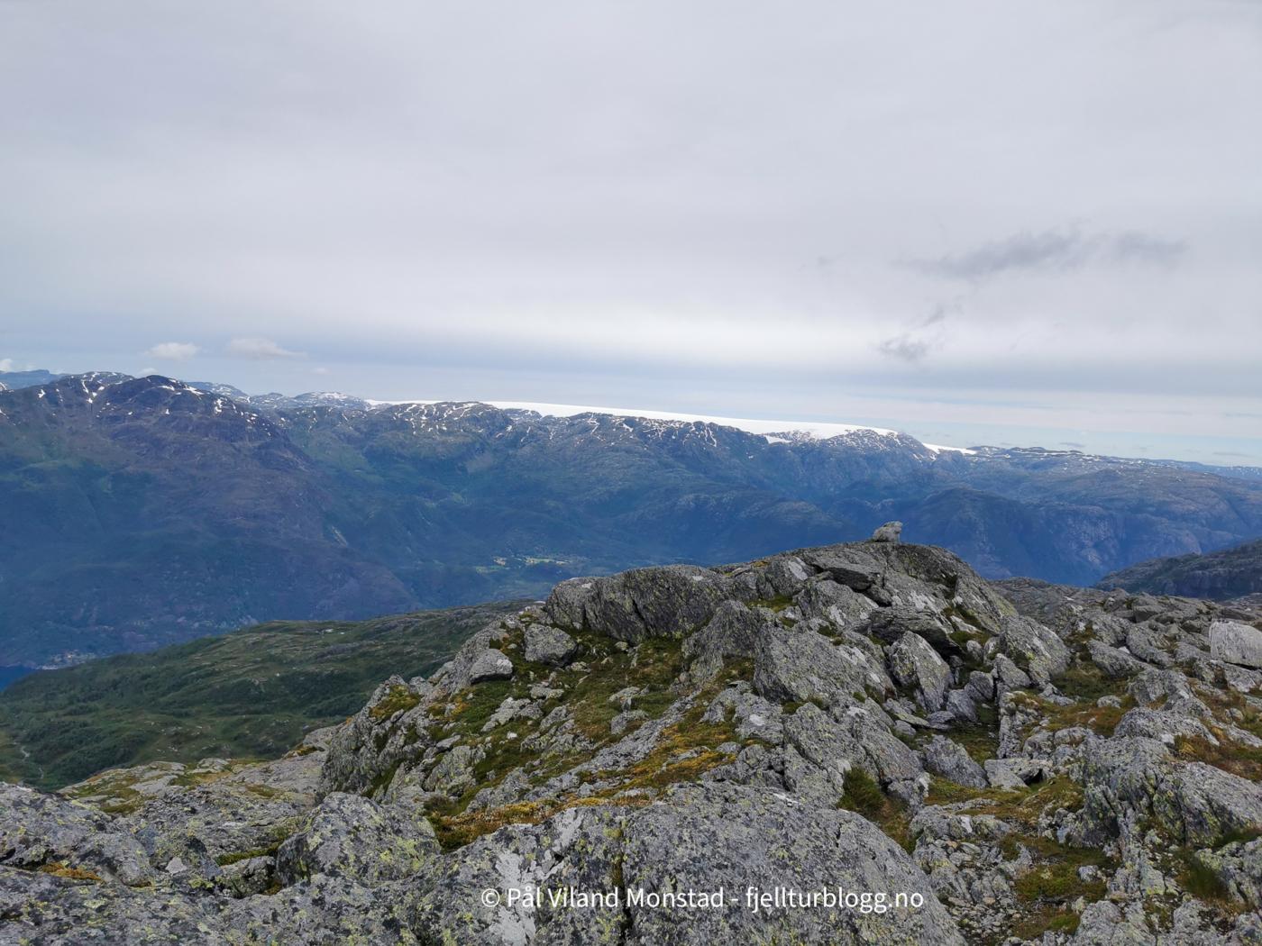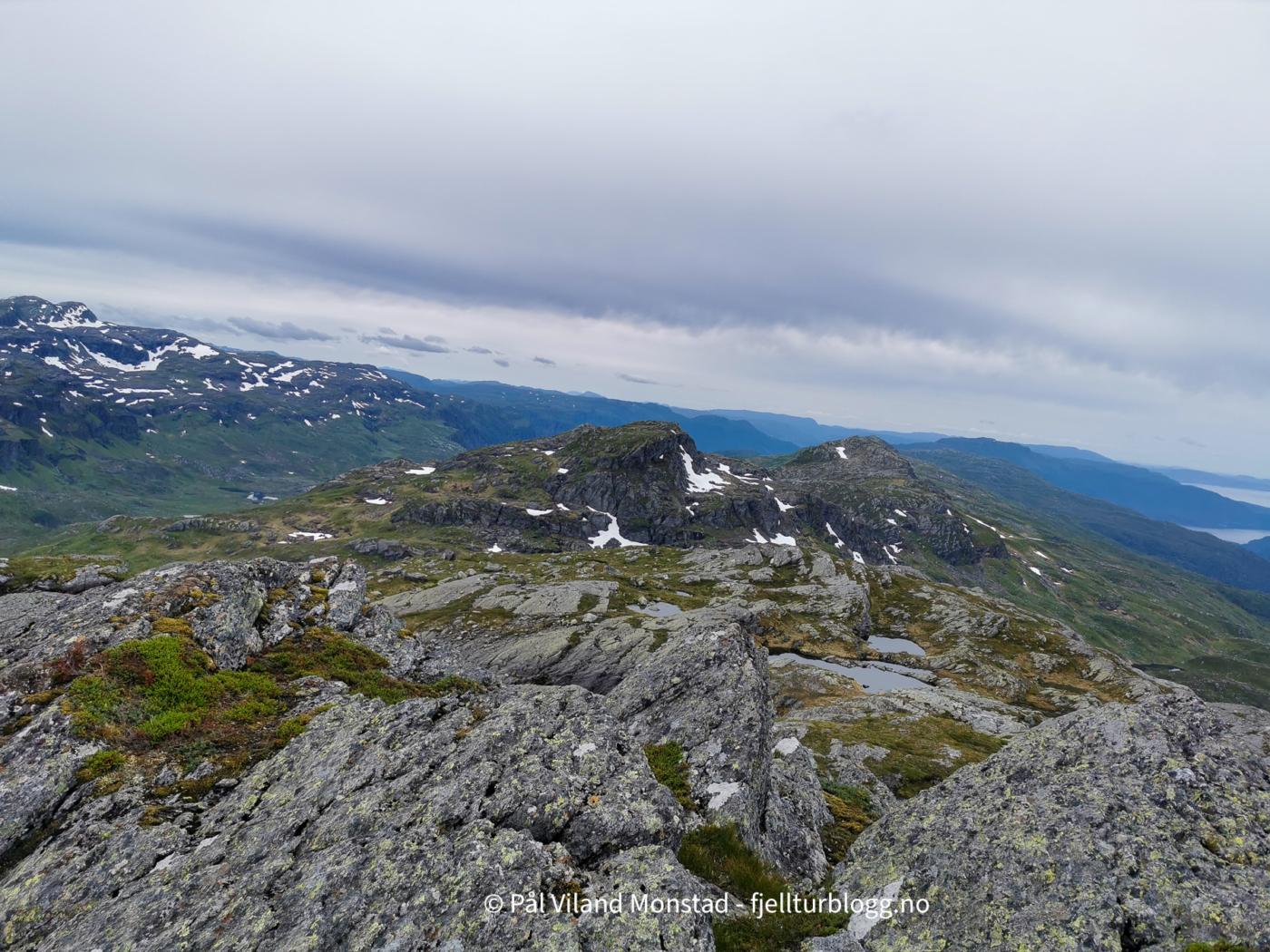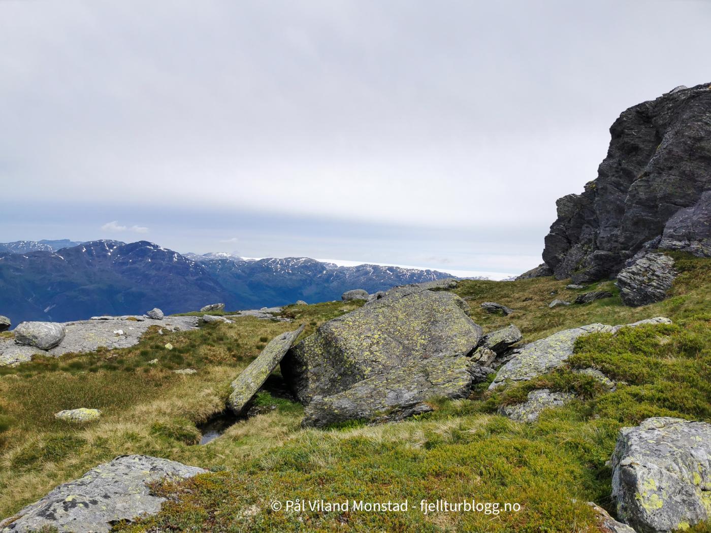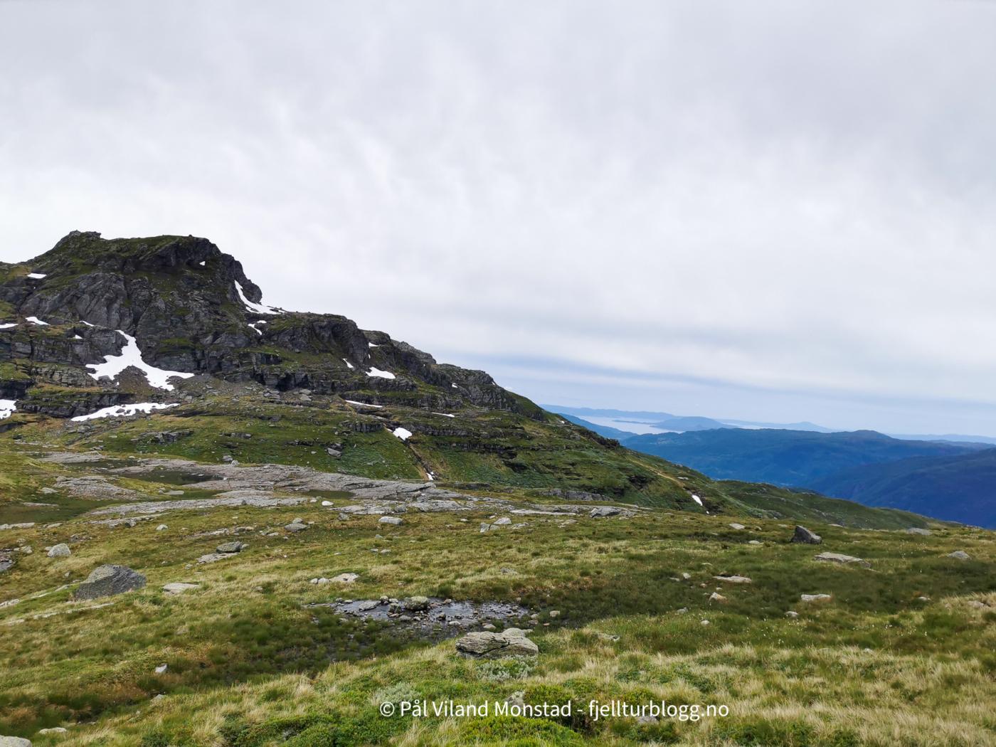 Fin topp med stor varde, og fin utsikt. Folgefonna i nordøst, og utsikt langt ut i Sunnhordlandsbassenget. Vi gikk fra toppen i østlig retning, og fant en bratt nedfart som førte oss ned sør for Kuskardvatnet. Vi gikk videre i nordøstlig retning, til østsiden av vannet. Flere hyller førte oss oppover mot toppen. Også her måtte vi en del nord før vi kunne dreie i sørlig retning mot toppen av Møssegronuten nordøst (ikke navn på kartet). Ingen varde, så dette er kanskje en topp for mer spesielt interesserte.