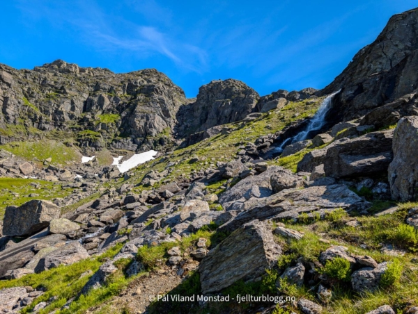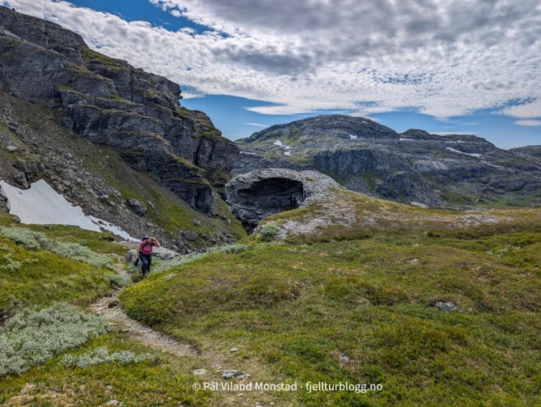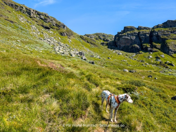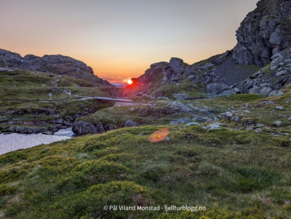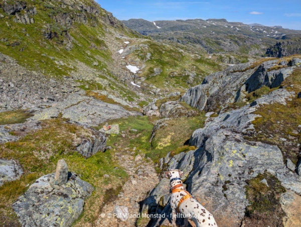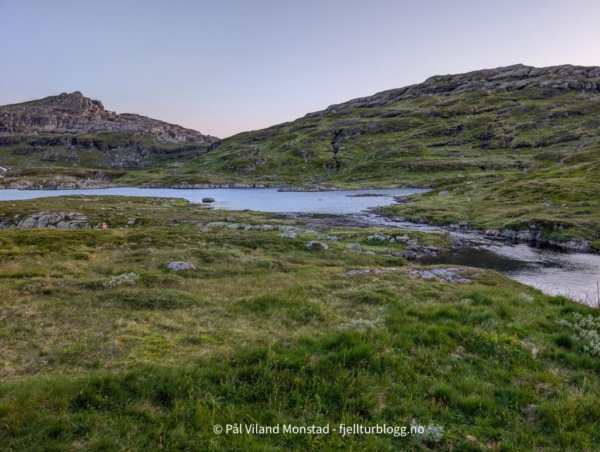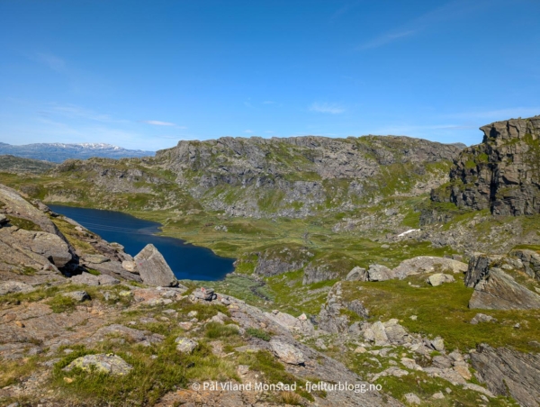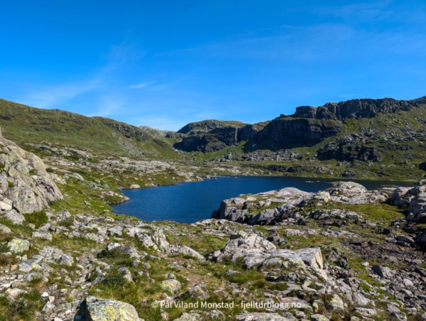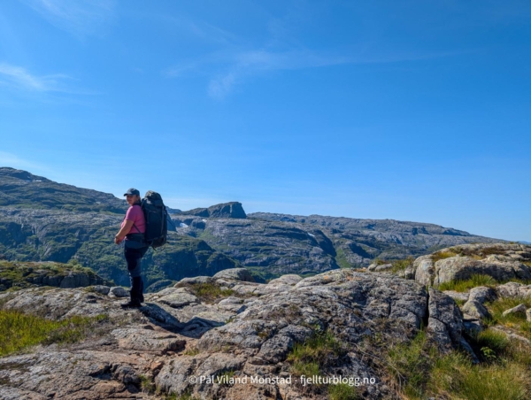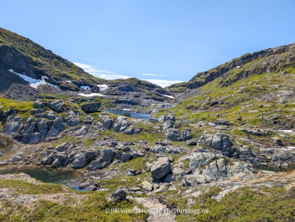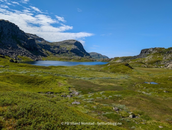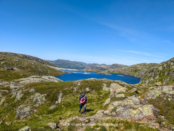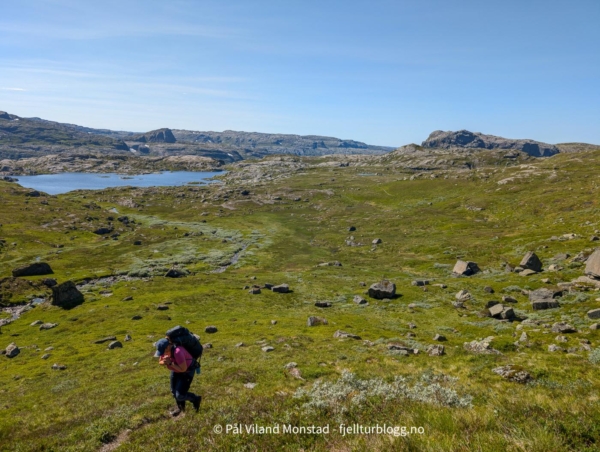 Fra stikrysset var det en fin tur videre. Kupert som alltid i denne delen av landet, med noen ganske bratte ned- og oppstigninger. På en varm dag med flere og tjue grader og tilnærmet null vind ble det en tur med mange pauser underveis. Både for å drikke, men ikke minst for å nye naturen og været. Naturen i denne delen av Suldalsheiene er langt mer frodig enn i de høyereliggende områdene.