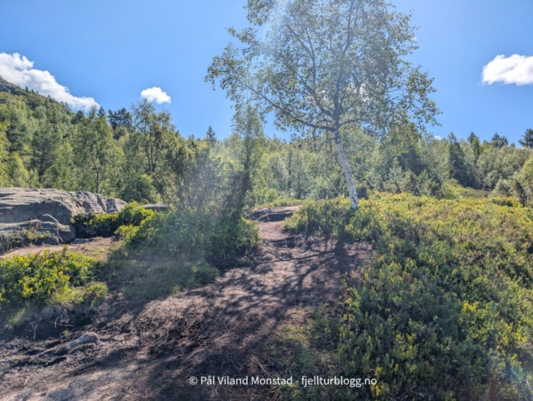 Stien oppover skogen var tørr og fin, og heller ikke spesielt bratt. Det passet fint med mye skygge gjennom skogen, for det var en varm dag uten særlig vind. Det var et jevnt sig av andre fjellvandrere på tur. Noen tok vi igjen. Andre passerte oss i høyere tempo. Uansett ikke noen følelse av å gå i kø.