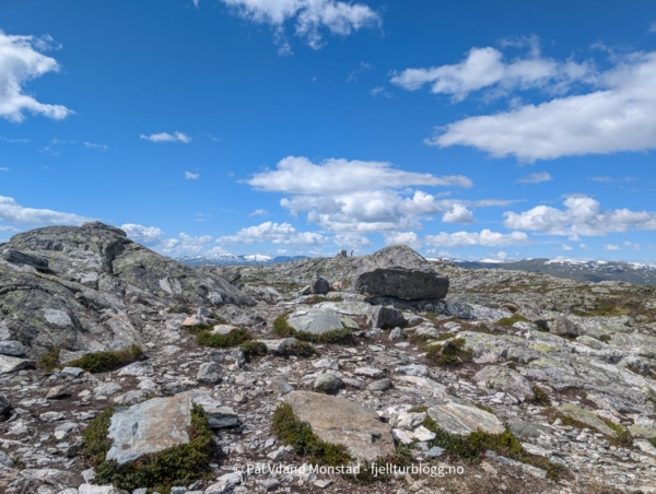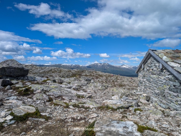 Fra toppen kunne vi skimte de sørligste delene av Jostedalsbreen i nord. I sørøst de karakteristiske toppene i Hurrungane med Fannaråki og Skagastølstindane.