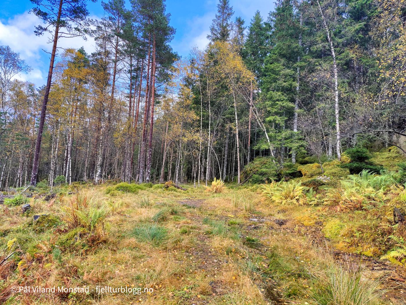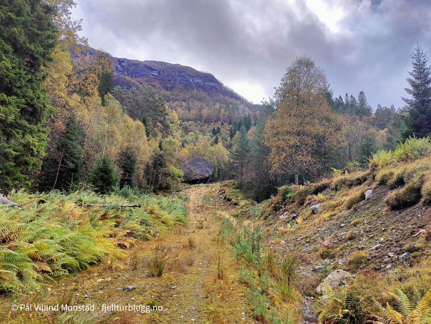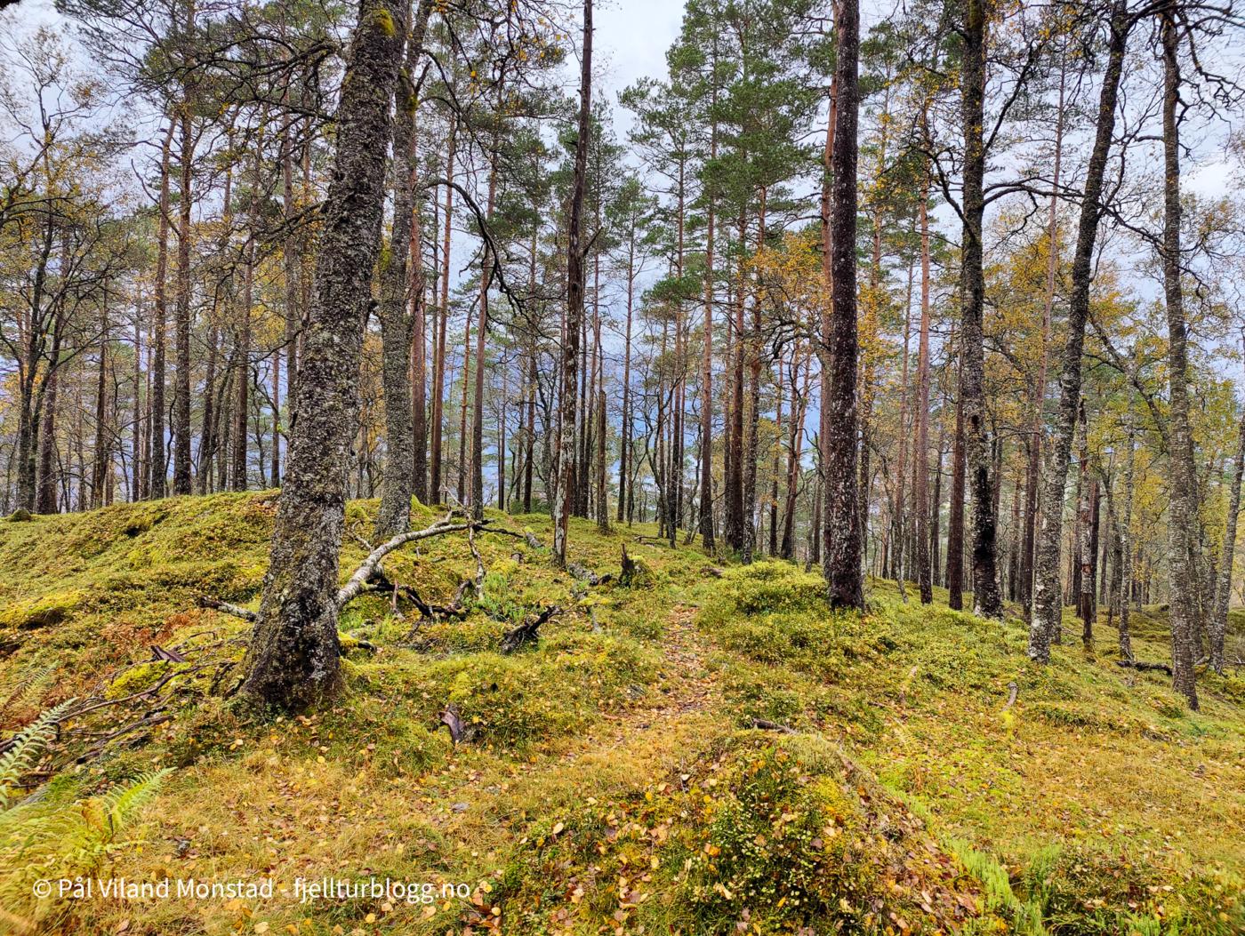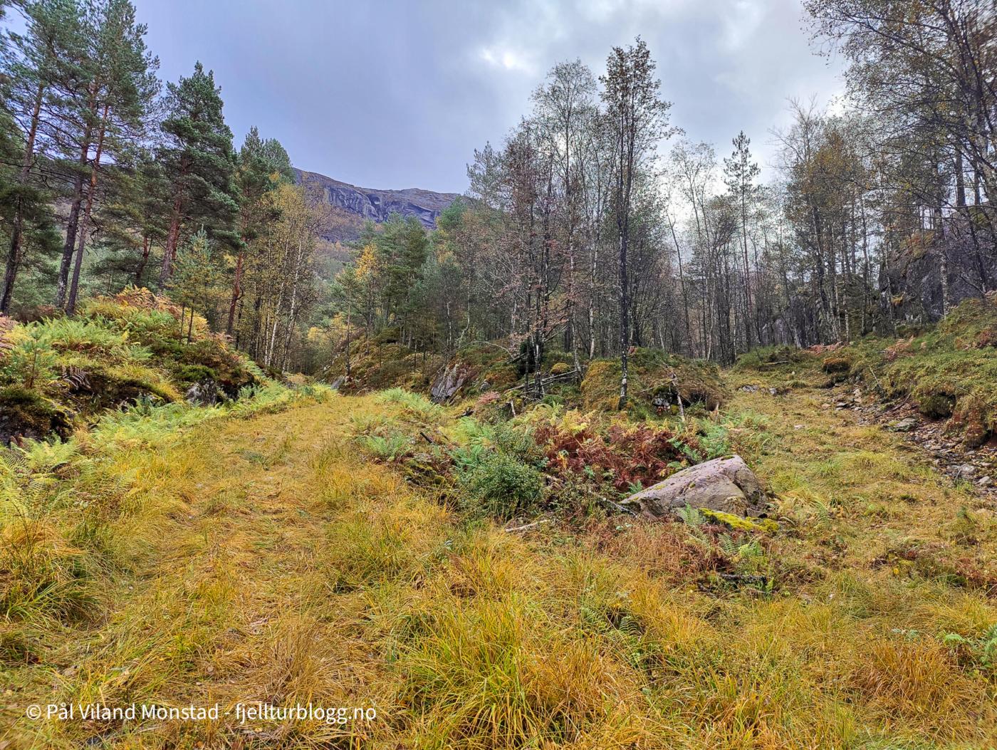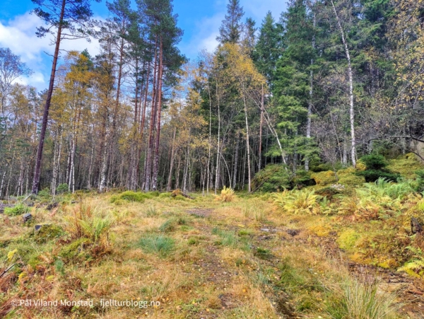 Skogsveien var lett å følge. Flere bratte partier, men det flatet etter hvert ut der veien gikk i nordøstlig retning på kartet. Veien sluttet, og jeg fortsatte på svært tydelig sti inn i skogen. Etter kort tid på stien, og jeg kom til en mindre bekk. Her viste kartet at det skulle gå ny sti mot toppen Jeg fant stien lett, og fulgte den oppover langs bekken.