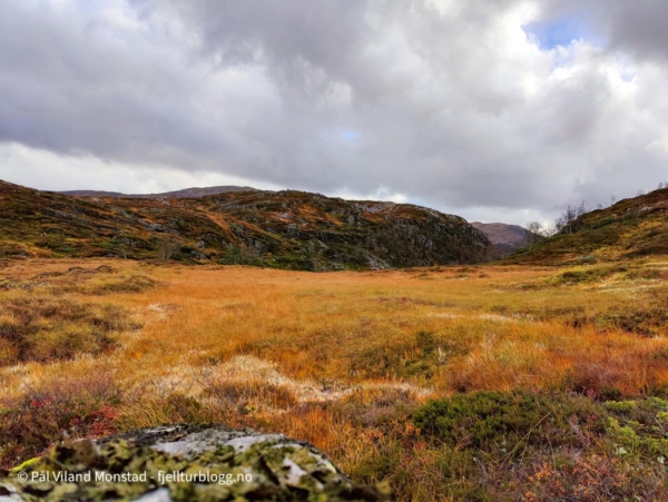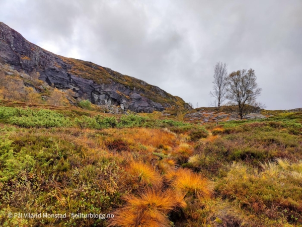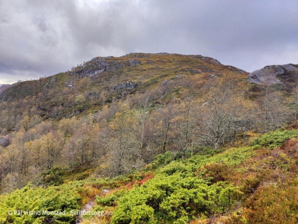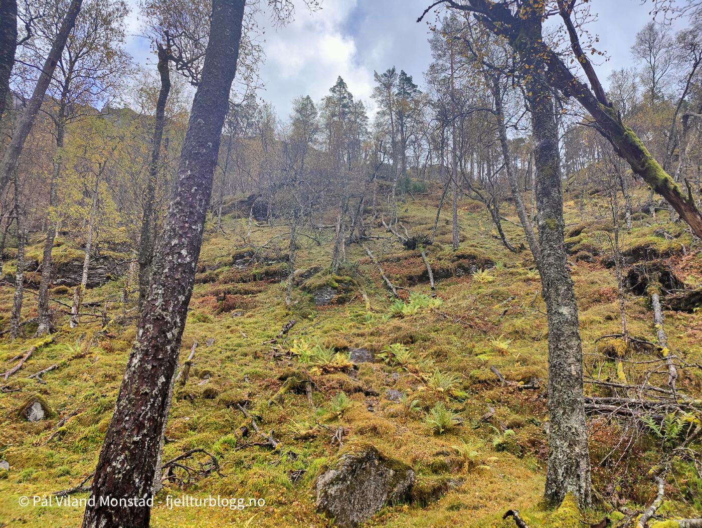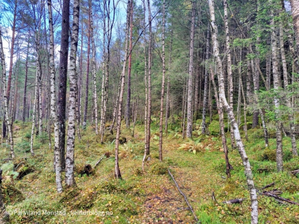 I følge kartet fortsatte stien ned til en støl/hytte i lia over Velavatnet. Jeg tok av fra stien i det den gikk nedover, og fortsatte i fjellbjørkelia i retning toppen, som var ganske så markant i vest.