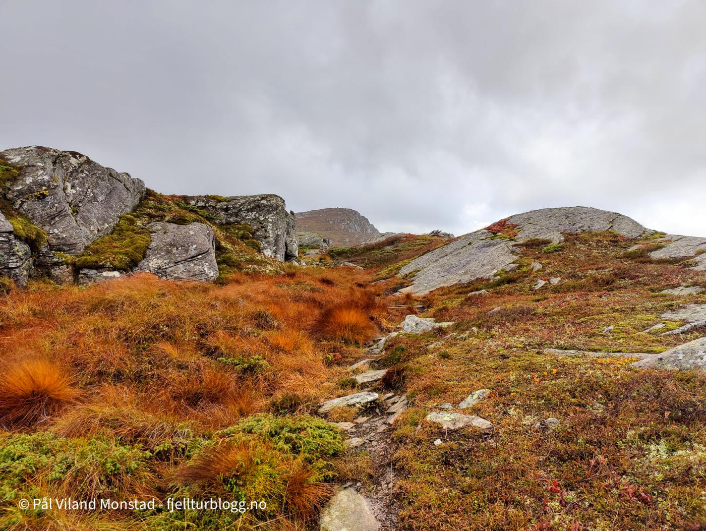 Stien må være mye brukt, for den var ryddet for træ,r og var ellers svært tydelig i terrenget. Jeg tok stadig høydemeter, og etter hvert ble det fin utsikt over Sandsfjorden og ned til gardene langs Sandsvegen. Over tregrensa flatet det mer ut, og jeg fortsatte i lettgått terreng.
