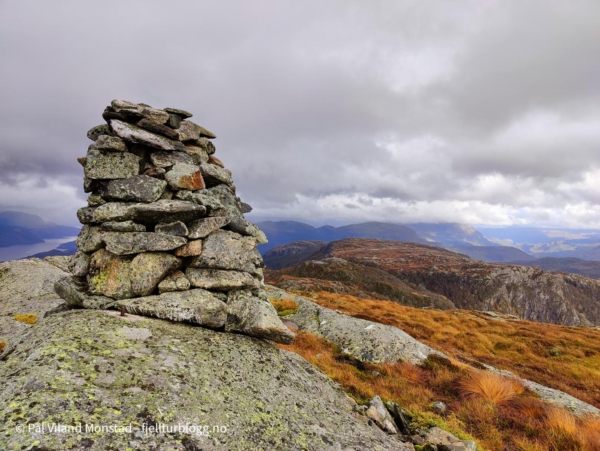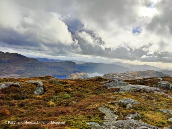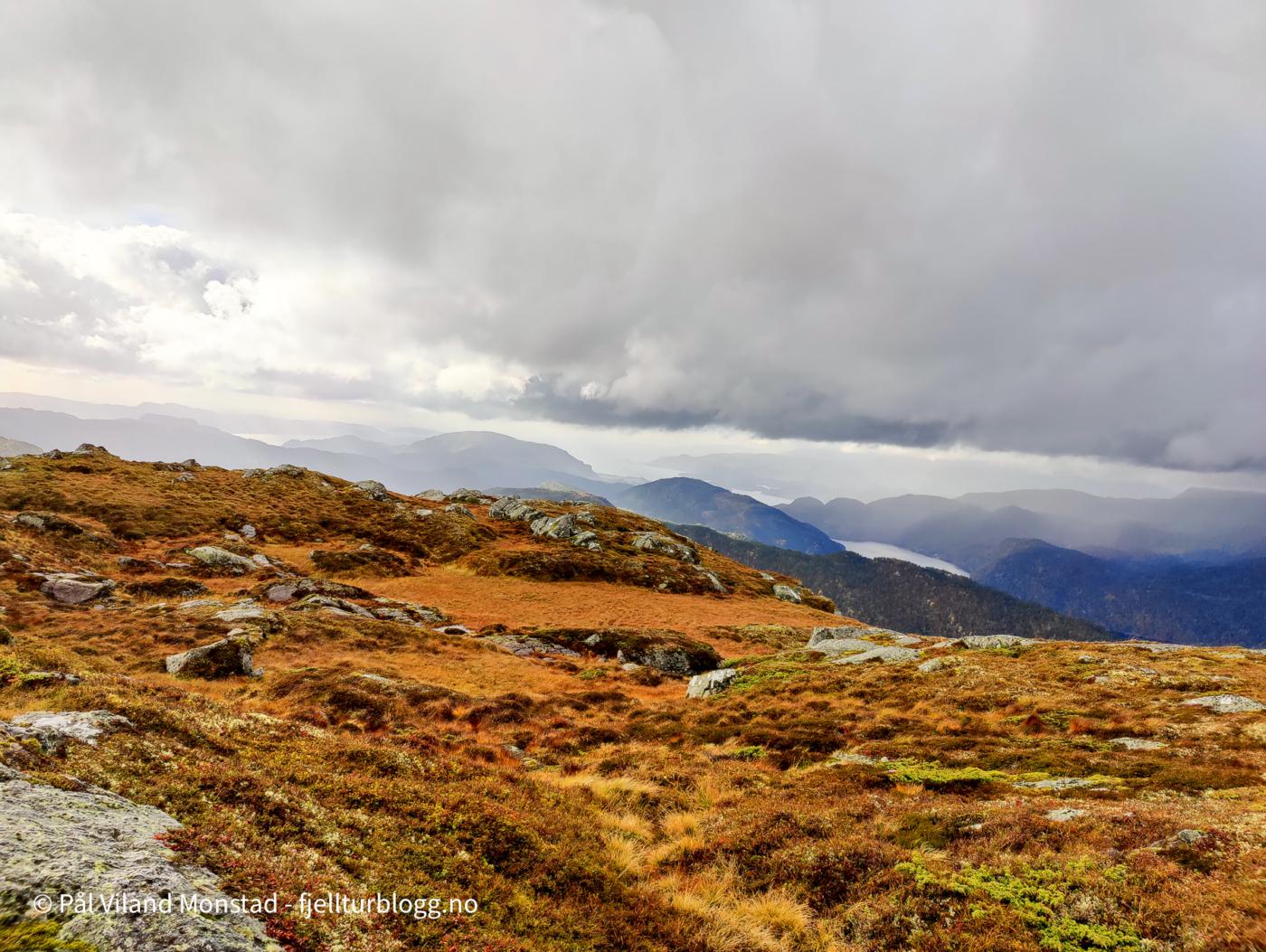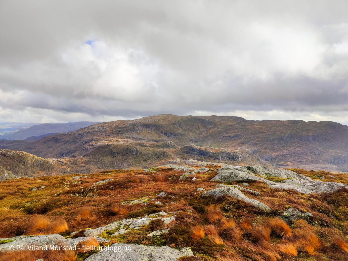 Det var ikke lange stykket oppover mot toppen. Myr og lyng, og lite fast fjell, men likevel greit å gå. Varden kom til syne, og ikke lenge etter kunne jeg nyte utsikten i den friske vinden på toppen, 777 moh. Fin utsikt mot Sand, Saudafjorden og videre utover Boknafjorden. Skyer la en demper på dagens utsikt, men jeg vil tro det er flott her oppe på en solskinnsdag.