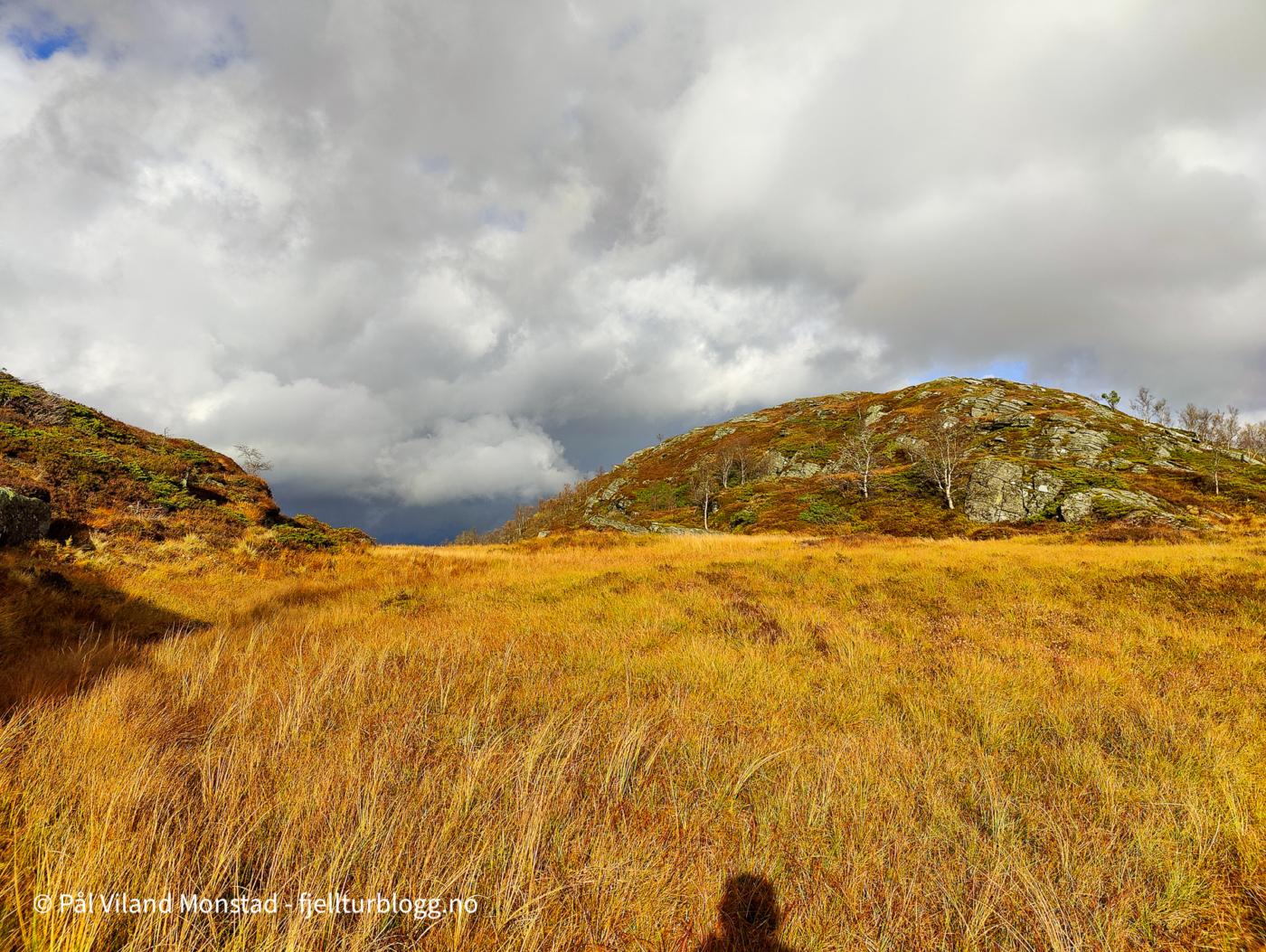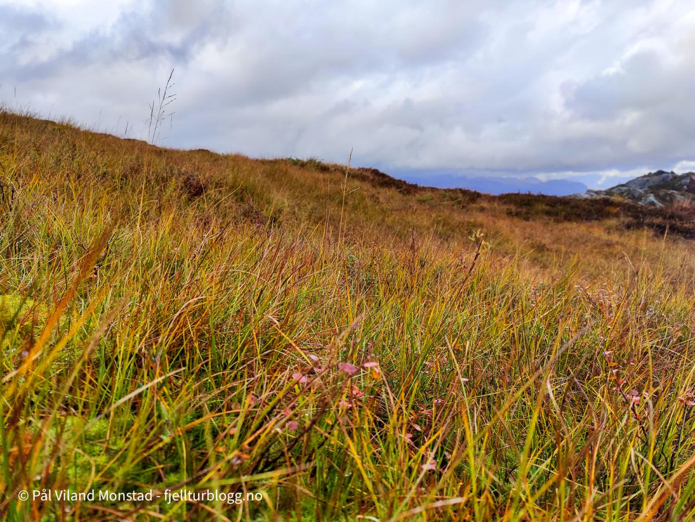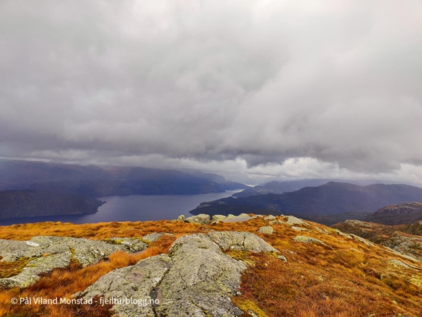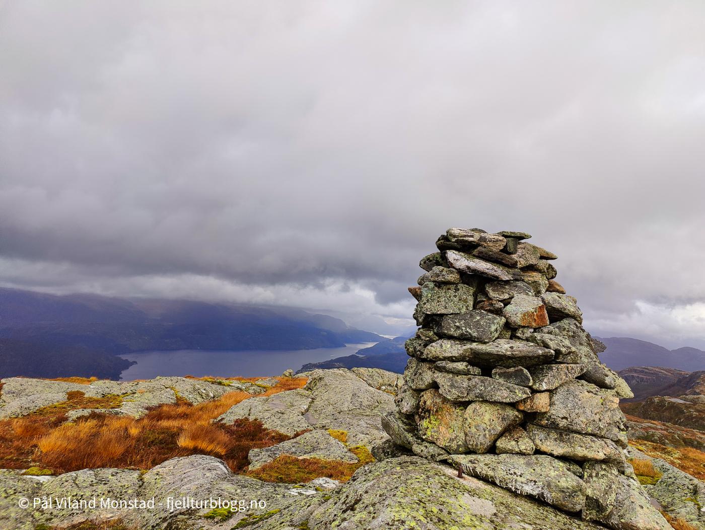 Det var ikke lange stykket oppover mot toppen. Myr og lyng, og lite fast fjell, men likevel greit å gå. Varden kom til syne, og ikke lenge etter kunne jeg nyte utsikten i den friske vinden på toppen, 777 moh. Fin utsikt mot Sand, Saudafjorden og videre utover Boknafjorden. Skyer la en demper på dagens utsikt, men jeg vil tro det er flott her oppe på en solskinnsdag.
