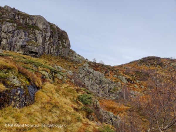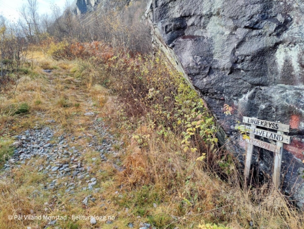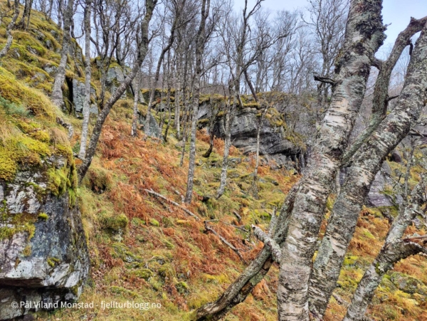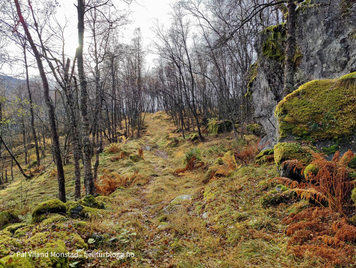 Stien er tegnet inn på kartet, og er lett å følge. På veien passeres Likhidleren, og flere skilt med navn. Jeg fulgte stien til omtrent rett sør for topp 691. Her tok jeg bratt opp bjørkelia. Ingen sti, men relativt lett å gå likevel, stigningen tatt i betraktning.