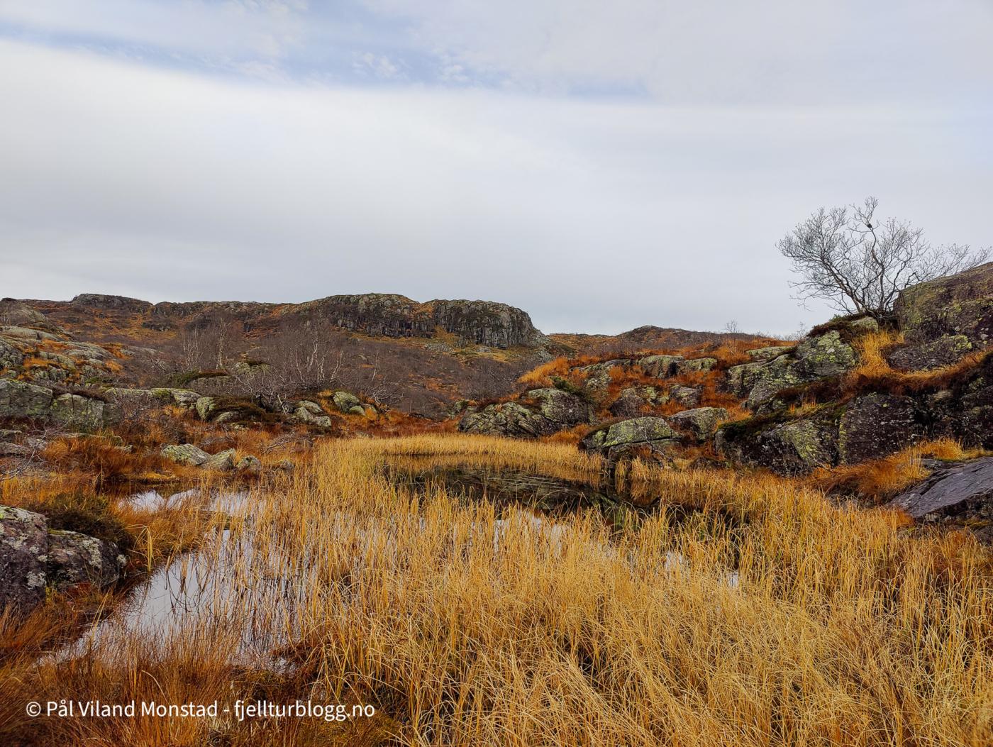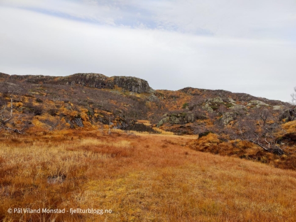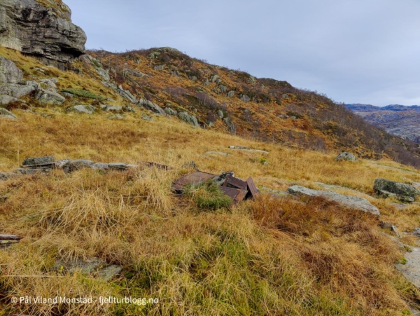 Oppe på en liten flate fant jeg et dyretråkk jeg fulgte på vestsiden av topp 691. Flere småtjern ble passert på østsiden, innover mot Øvstestølen. Det finnes bare rester av stølen i lyngen, murer, noen stokker og vedovnen.