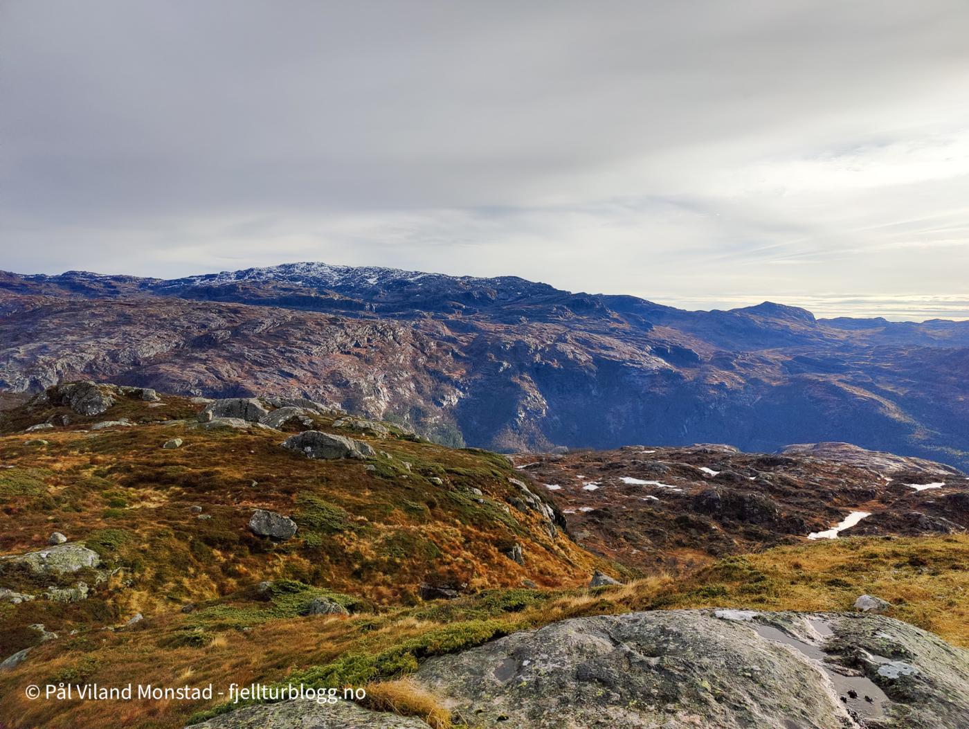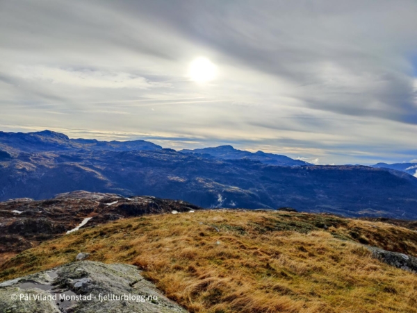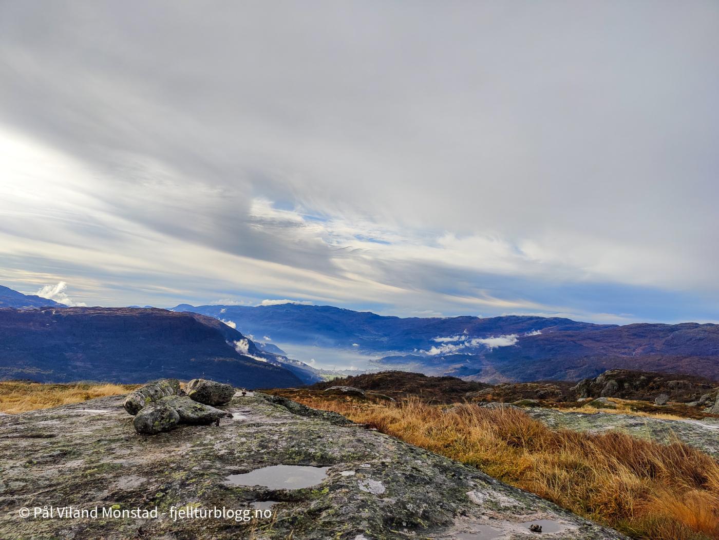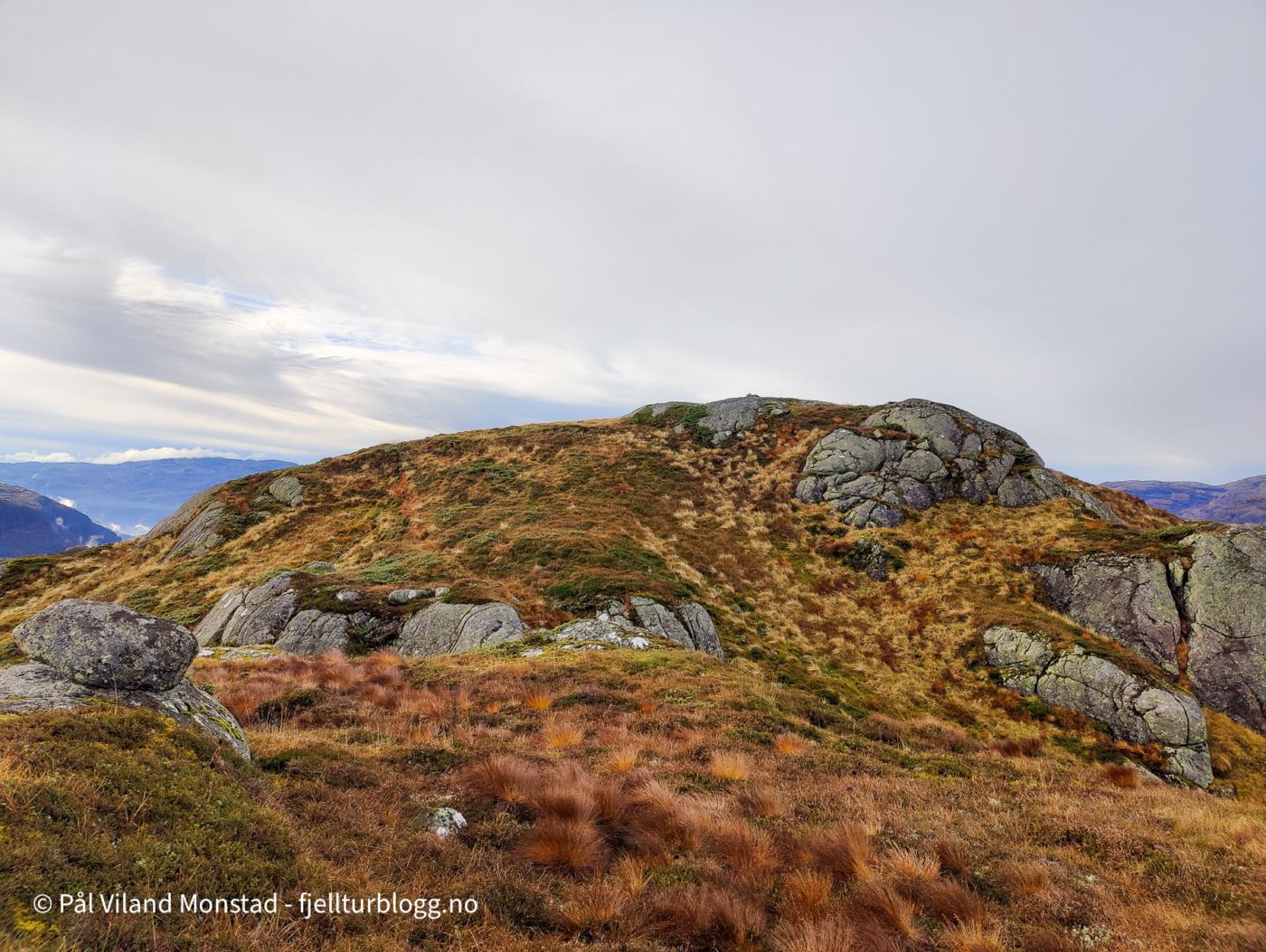 Fra Øvstestølen, som ligger rett sør for toppen, gikk jeg opp skaret øst for toppen. Å komme opp på baksiden var lett. Oppe fra toppen 809 moh var det fin utsikt mot Kyrkjenuten og Røldalssåta i nord og nordvest. I sør lå Skaulen og toppene på nordsiden av Hylsfjorden.