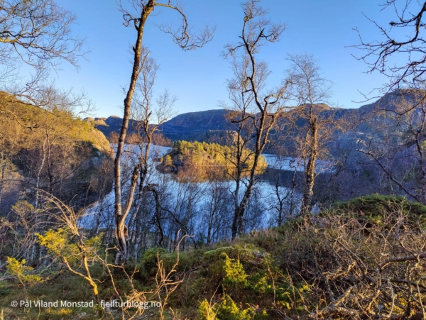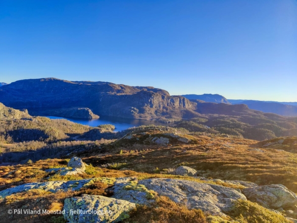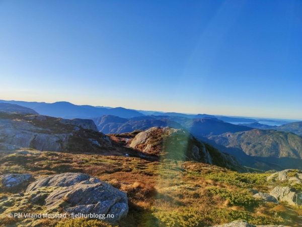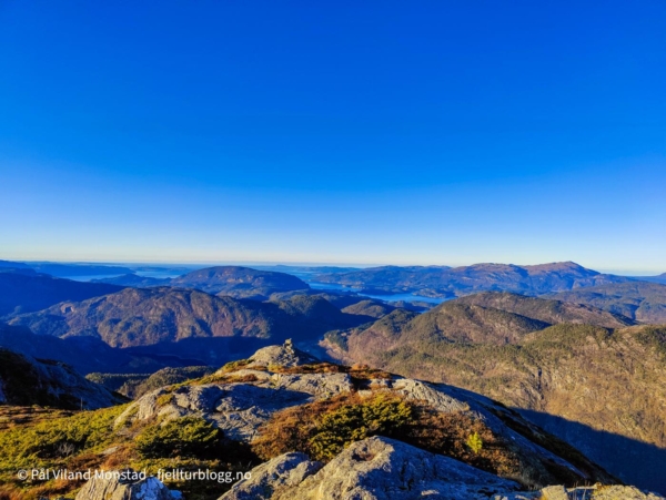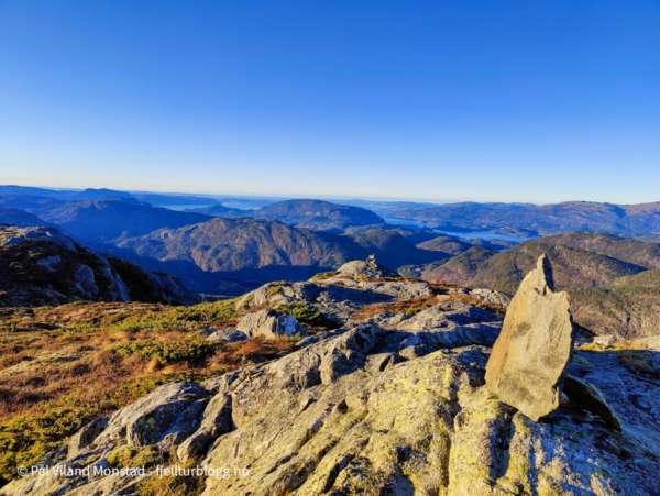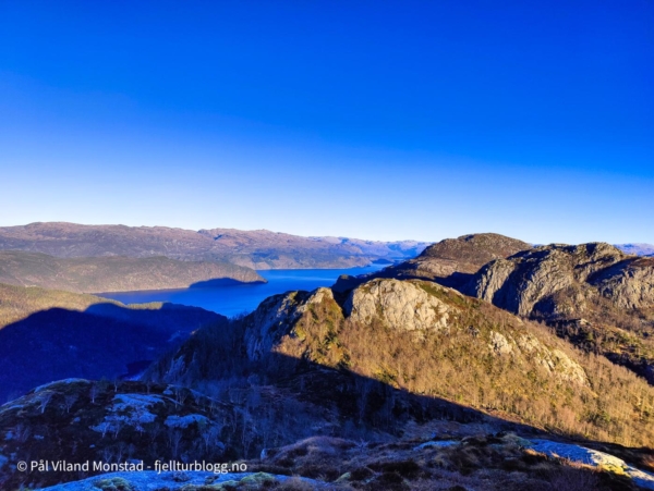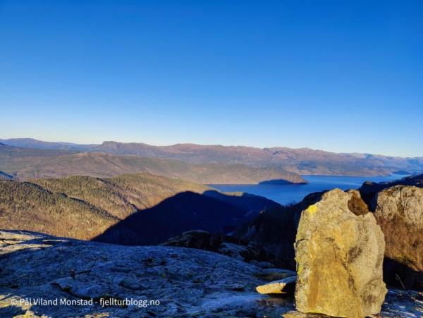 Utsikten var flott. Fjell og fjorder på alle kanter. Sand i øst, og Boknafjorden langt ute i vest. Det var vindstilt på toppen, men 4-5 minusgrader og ganske så kjølig. Jeg kledde på meg ekstra klær og kokte kaffe på primusen i finværet. Etter pausen bar det samme vei tilbake til bilen.