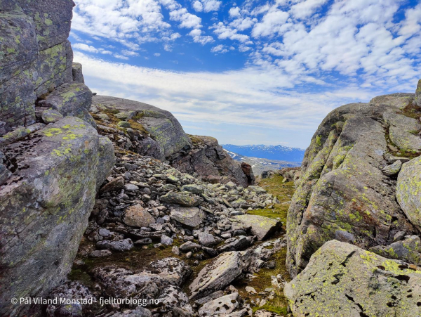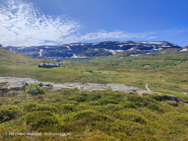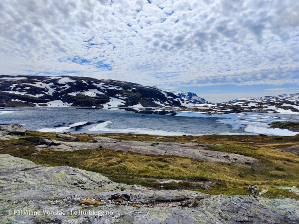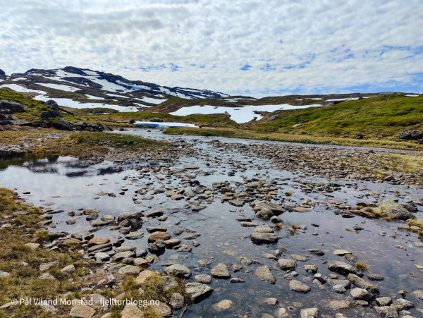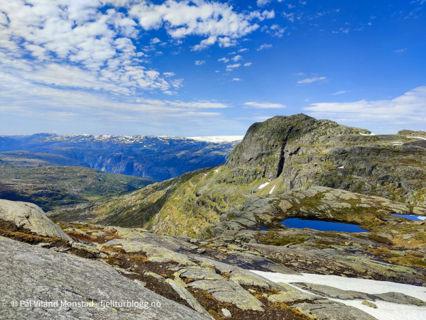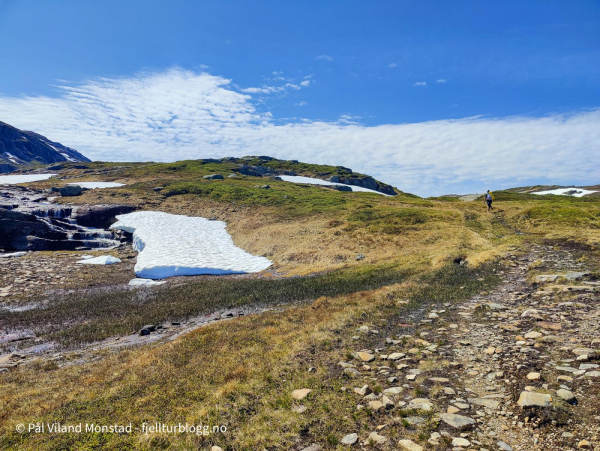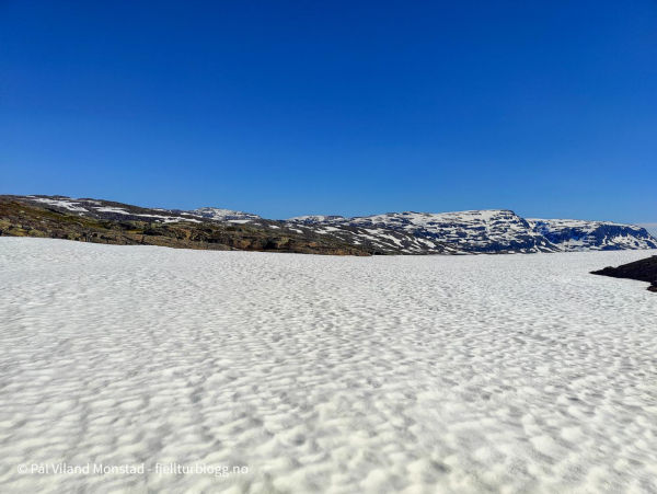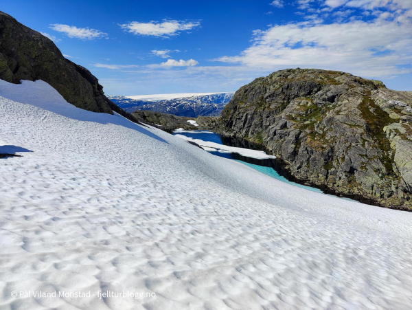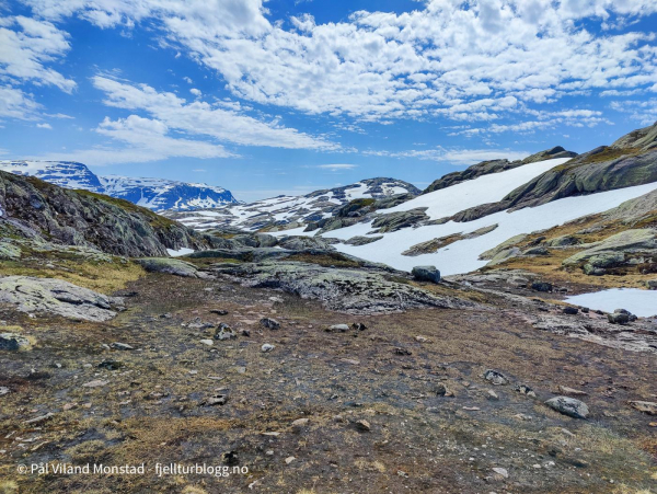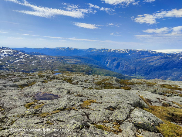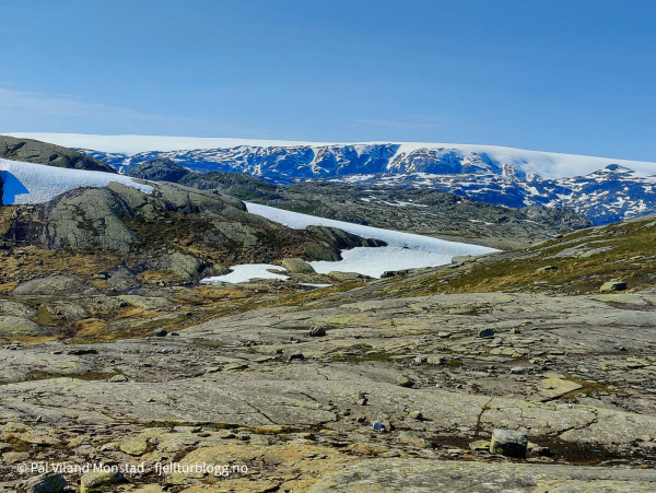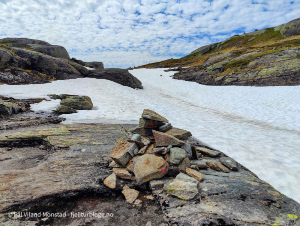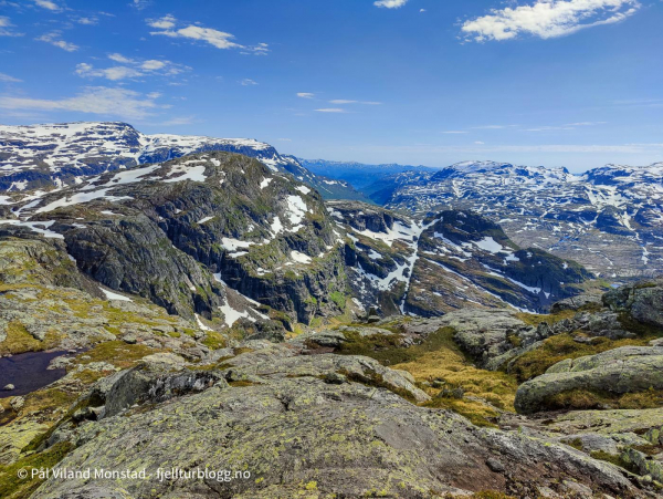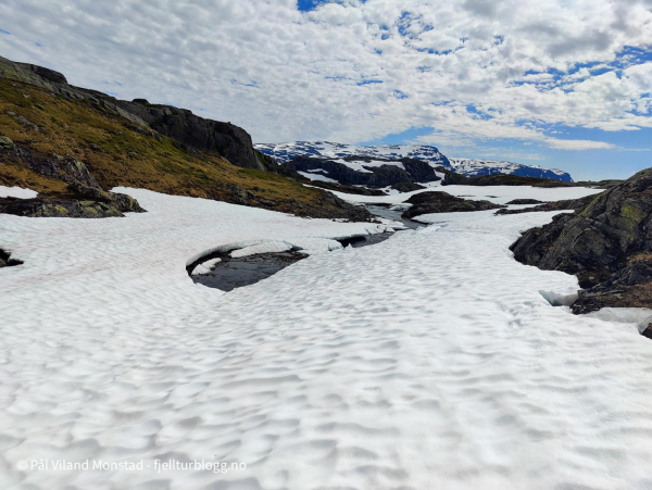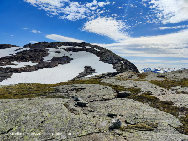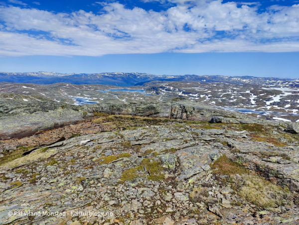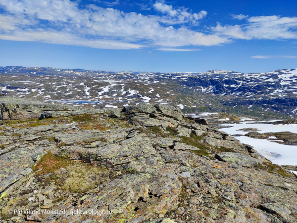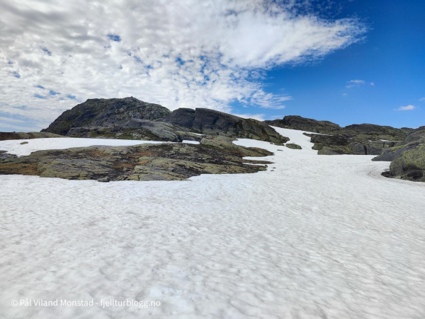Etter hvert kom jeg til Seljestadstølen, hvor jeg kom inn på T-merka rute videre opp anleggsveien mot Steinavatnet. Jeg kom meg tørrskodd over elva og kunne følge svære nødlinger/varder videre opp til Saudefaldene sin hytte ved Steinavatnet. Veien videre gikk langs merka rute mot Simlebu, men etter hvert tok jeg av fra denne ruta i retning Sandvassheia, som hadde vært godt synlig siden jeg kom opp til hytte ved Steinavatnet. Jeg prøvde å holde høyden i sørvestlig retning. Det gikk ganske greit, men flere steder måtte jeg ned og opp av smådaler og skar, eller rundt delvis islangt småvann. Jeg kom meg stadig nærmere dagens første topp, og siste parti opp mot toppen hadde langt mer stigning enn tidligere på turen. Jeg kom greit opp ryggen, og kunne nyte utsikten fra varden, 1320 moh. Varden står for øvrig på grensa mellom to kommuner/fylker: Sauda/Ullensvang og Rogaland/Vestland. Kyrkjenuten med sine drøyt 1600 moh var dominerende i sør. Ellers var det utsikt mot Slettedalen, og fjelltoppene på vestsiden. Jeg gikk samme vei tilbake ned i skaret mellom Sandvassheia og Borddalsnurten, og fortsatte opp til sistnevnte. Litt slakere opp dit, men også her ganske så kupert og med flere snøfonner.