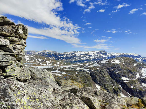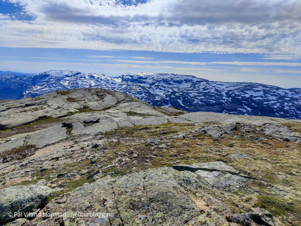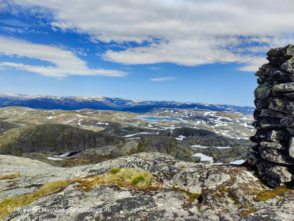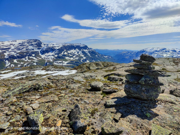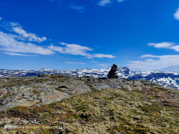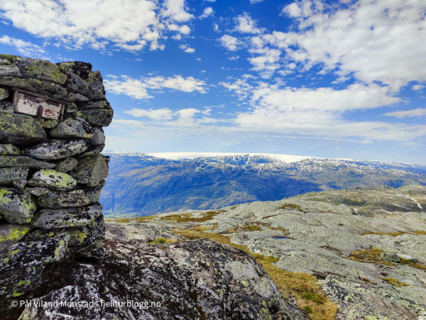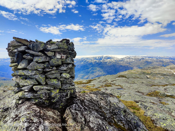 Varden på toppen av Borddalsnuten 1327 moh var av det staselige slaget. Også herfra var det flott utsikt. I nord Folgefonna. Jeg kunne også se E134 nede ved Rullestad camping. I retning vest kunne jeg se Simlebu. At Etnefjellene er svært kupert kunne jeg i alle fall konstantere herfra. Veldig mye ned fra denne siden av dalen, før det gikk opp igjen mot Simlebu.