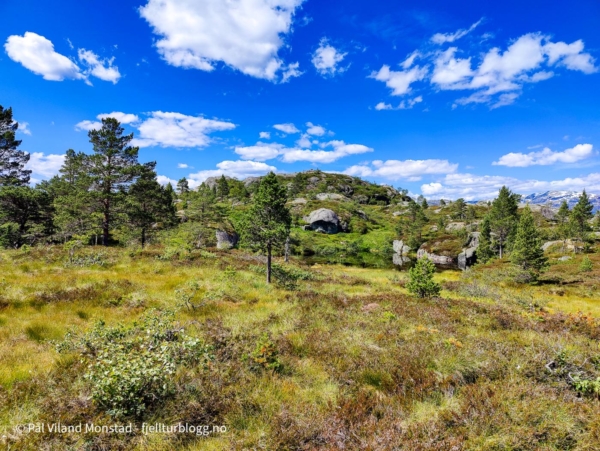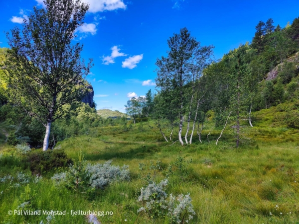 Bilen ble parkert i enden av veien i Trodladalen. Hit kommer man fra Nesflaten, mot Bråtveit, Vetrhus og Moskar. Fra parkeringen gikk det først over myr, før jeg fant stien i høyre kant. Denne var tydelig i terrenget og lett å følge. Lenge. Nede i den svært bratte lia mista jeg stien. Det vil si, det virka å være et stikryss hvor jeg tok til høyre og endte til slutt opp i et svært bratt område med skrenter, og null sti. Opp igjen, og inn til venstre i “krysset”. Da kom jeg over på motsatt side av bekken, og stien fulgte et slakere terreng ned mot elva. Etter hvert ble det ny bommert, i det jeg fortsatte rett fram på en rygg omtrent rett nord for ei hytte/uteløe. Jeg endte da nede i den tørre elva, uten å se hvor stien skulle gå på andre siden. Det var svært bratt også på andre siden, og jeg hadde lest/sett bilde av ei bru here nede. Det bar derfor opp igjen, og ned på andre siden av ryggen, omtrent der en gammel telefonstolpe sto. Stien førte ned til brua, og enda ei uteløe.