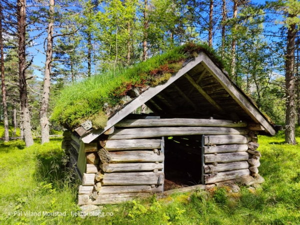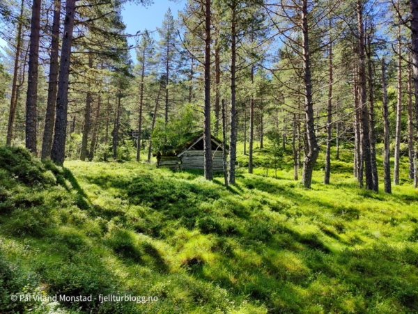 Jeg kom meg over brua og fant sti på andre siden. Denne fulgte jeg opp lia til det flatet ut. Her fant jeg flere uteløer. Jeg fulgte ikke sti videre, men fulgte kartet. Siste hytta jeg kom til, muligens ei jakthytte, sto heller ikke inntegnet på kartet. Fra den og videre vestover mot toppen var det fortsatt kupert, med mye opp og ned. Jeg fulgte noen tråkk eller sti flere steder, men mistet den stadig.