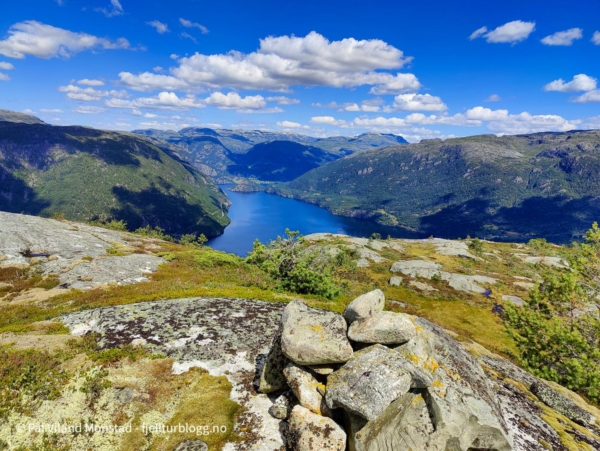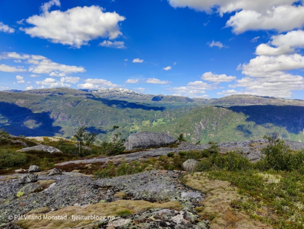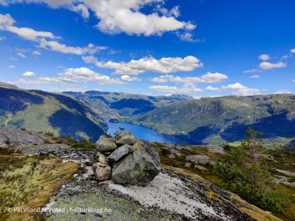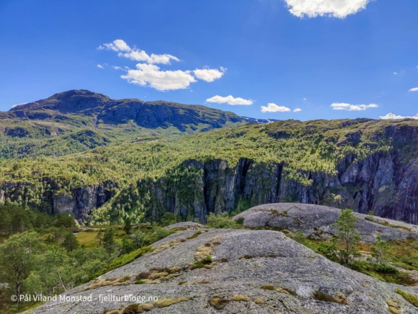 I sør skar Rodlevsjuvet inn fra sørvest, med loddrette bergvegger. Et utrolig vilt landskap! Omsider kom jeg til varden på toppen, 684 moh. Flere og tjue varmegrader, null vind og null bekk hadde gjort av vannflaska var tom. Det var bare å nyte utsikten mot Suldalsvatnet, Nesflaten, Hamrabø og Skaulen, sammen med diverse pausemat, før ferden fortsatte tilbake samme vei jeg kom.