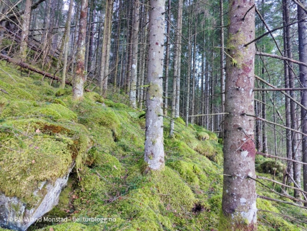 Etter å ha besteget Rødsnuten gikk bilferden videre i retning Erfjord og Erøya. Jeg parkerte et stykke etter bebyggelsen, i retning Tednes.Jeg fant en parkeringslomme via-a-vis en grusvei som gikk opp i riktig retning. Rett før veien kom til et uthus tok jeg opp langs et gjerde. Det gikk fortsatt sauer ute, og flere var av den nysgjerrige arten som skulle bort og snuse. Etter et kort stykke kom jeg opp til en høyspentlinje. Den burde jeg fulgt, slik jeg gjorde på returen. I stedet gikk jeg opp i granskogen. Det ble en kort tur i uryddig underlag blant grantrærne, før jeg kom til skogsveien som var inntegnet på karet.