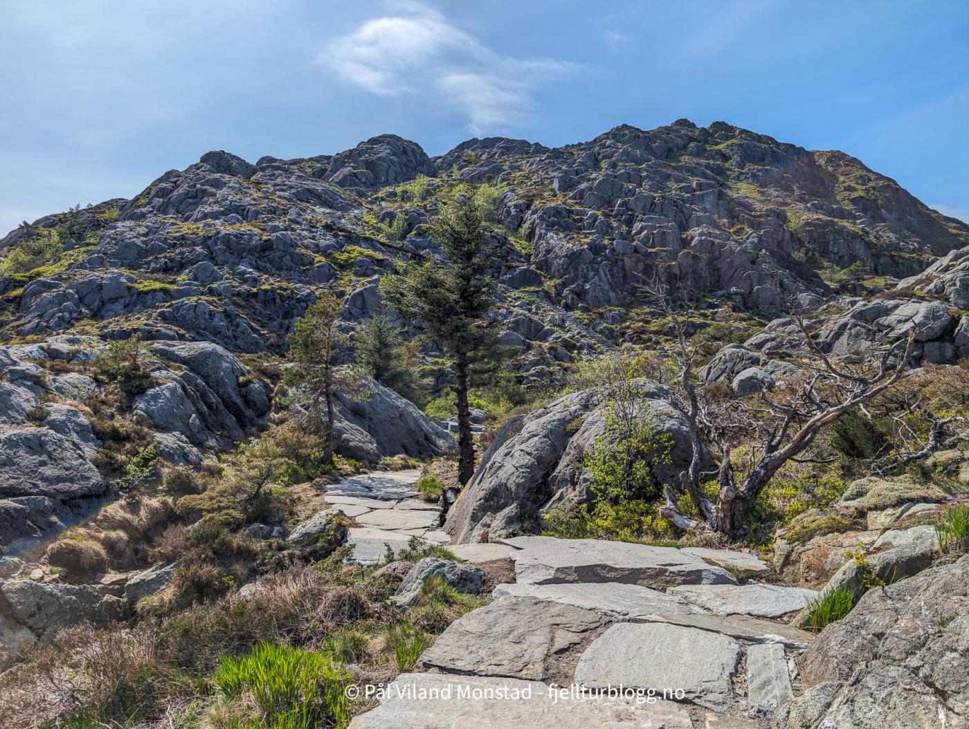 Liker du mer urørt terreng er det mye kjekkere å ta turen fra vestsiden. Uansett er det flott utsikt fra toppen!