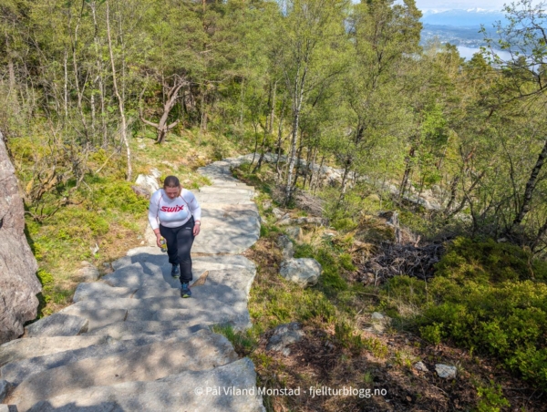 Egentlig ikke så mye å si om turen. Du starter på traktorvei og går etter hvert over i sherpatrapper som fører deg til topps. Du kan fint gå med tøfler på beina, for dette er en svært tilrettelagt tur. Liker du trapper er denne turen for deg. God trappetrening!
