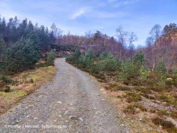 Jeg kjørte rv13 fra Lovareid i retning Erfjord. Ved kirka i Erfjord tok jeg av til venstre mot Østerhus. Deretter et godt stykke oppover, før jeg tok av til Hausland. Rett før gårdstunet tok jeg av til venstre på skogsveien, som også er inntegnet på kartet. Jeg burde parkert ved første uthus, men kjørte et godt stykke på veien, som holdt lav standard. Jeg parkerte etter et stykke siden veistandarden ble dårligere etter hvert. Det var bare å ta beina fatt videre på veien, inn til to hytter i østre ende av Holmatjørna.