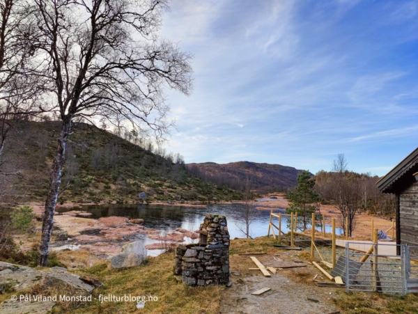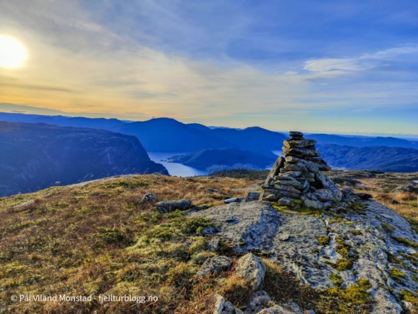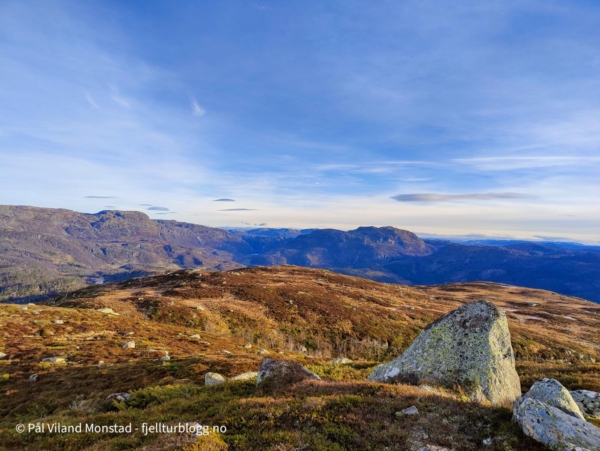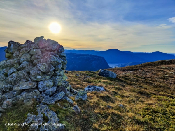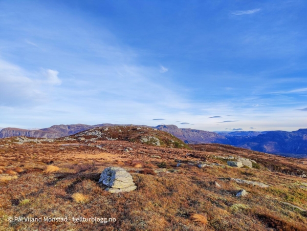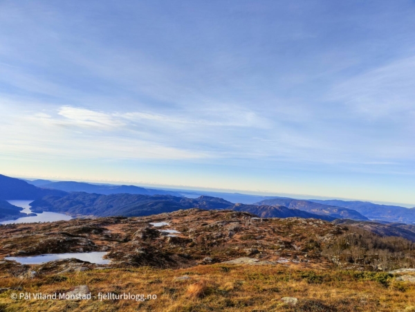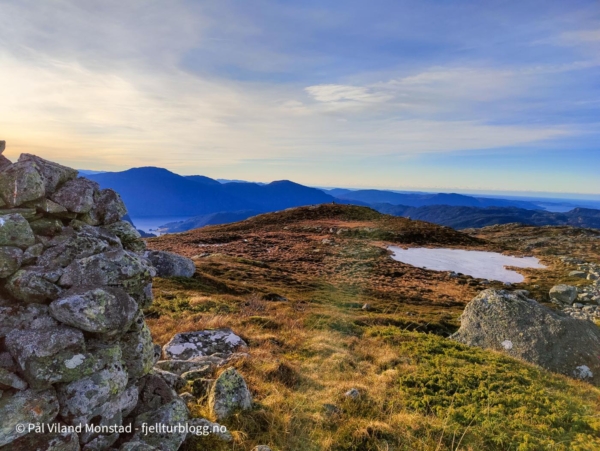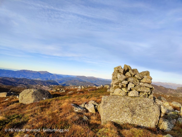 Vel oppe på Skipet, 700 moh, var det fin utsikt. Litt lenger vest lå det en minst like fin varde. Jeg tok turen bort dit og, i finværet. Vind kombinert med noen få minusgrader gjorde at jeg ikke ble værende særlig lenge. Det var bare å komme i ly for vinden. Nede ved tjørna tok jeg mat- og kaffepause, før turen gikk samme veien tilbake til bilen, men ved Holmatjørna gikk jeg nå på nordsiden, hvor terrenget var bedre.