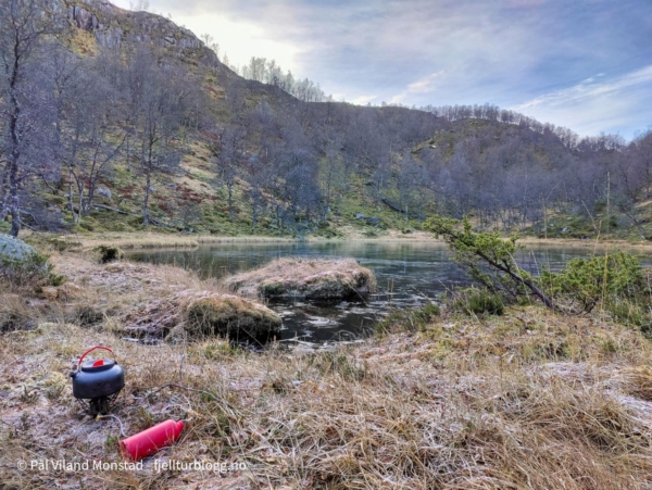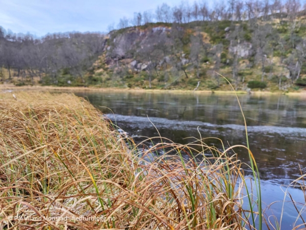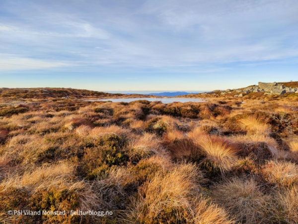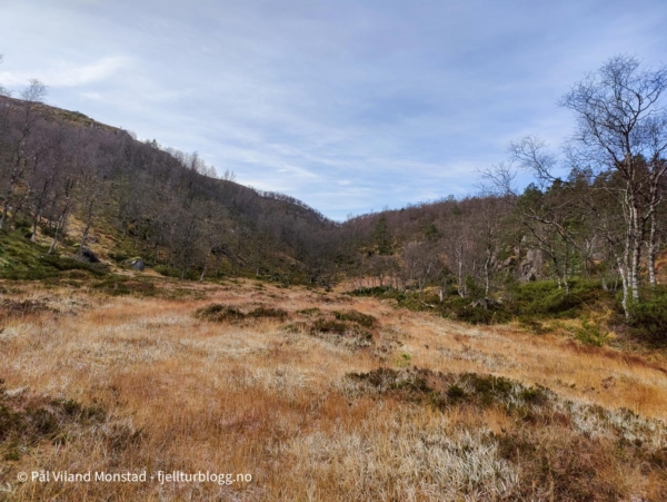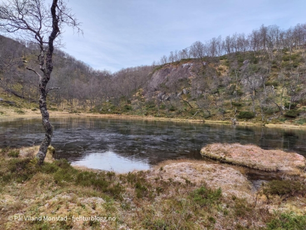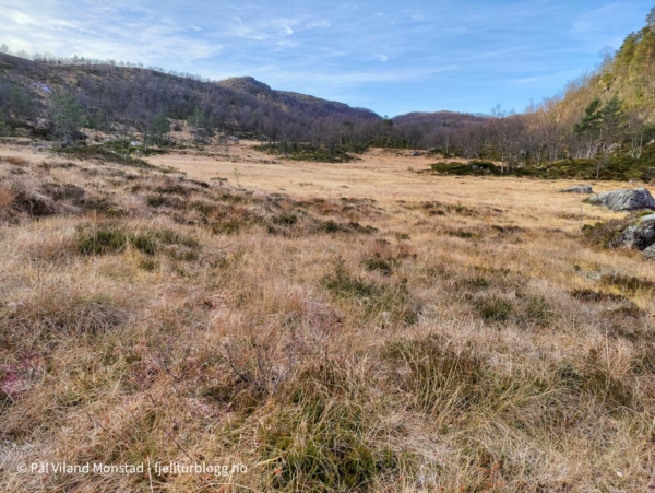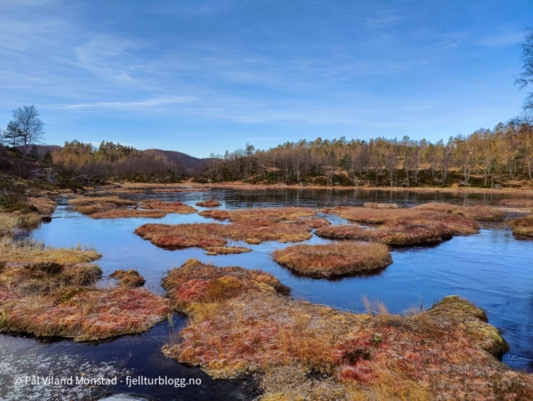 Jeg gikk langs sørsiden av tjørna i ganske kronglete terreng, men det bedret seg raskt videre vestover. Jeg valgte å gå over myrene innover mot Tjøndal, siden frost den siste tiden gjorde at de bar. Rett og slett en fryd å gå over slike lettgåtte myrer! Ved mer normale forhold vil det være bedre å holde i høyden langs kanten av myrene innover.