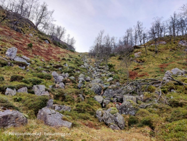 Den lille tjørna vest før Tjøndal passerte jeg også på sørsiden, før jeg gikk opp skaret mellom Skipet og Hovskavlen. Fra toppen av skaret dreide jeg mot toppen. Herfra var det svært lett å gå opp til toppen.