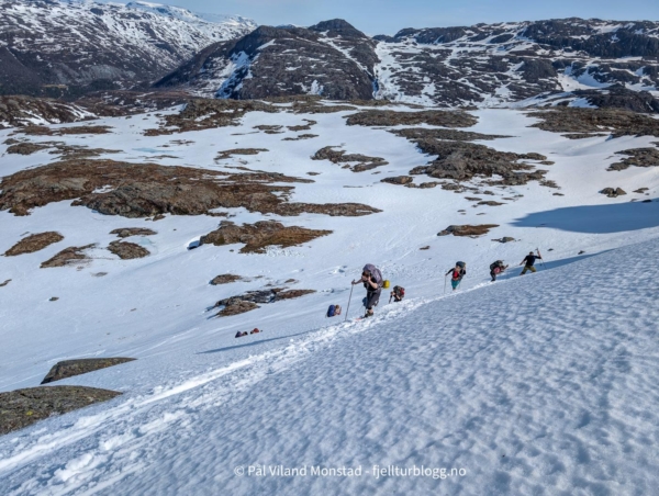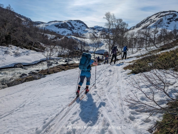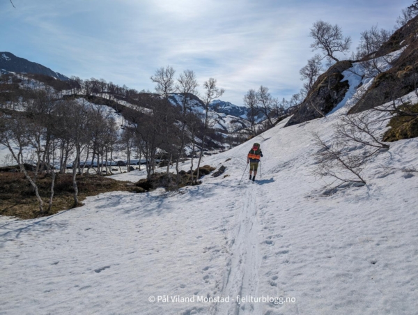Fra Sandvatnet gikk ferden ned lia omtrent der sommerruta går. Et godt stykke nede i lia var det slutt på snøen, og de siste hundre metrene til Jonstølen gikk med ski og staver festet på sekken. Fra Jonstølen gikk siste del av turen til fots langs veien tilbake til bilene i Moskar. Veien var brøyta etter at vi gikk inn to dager tidligere.