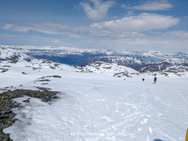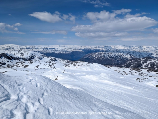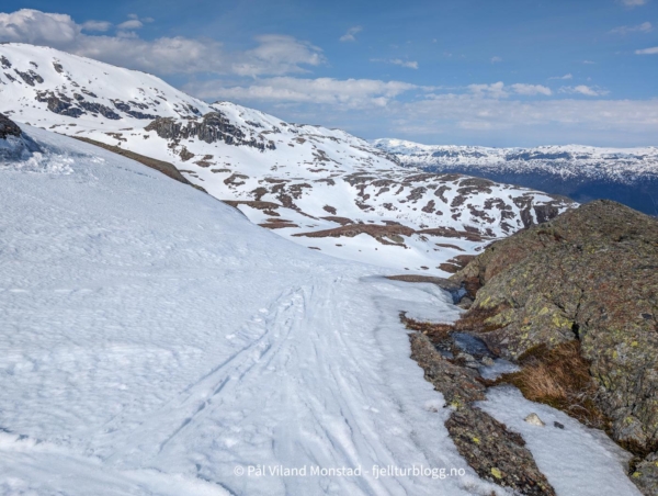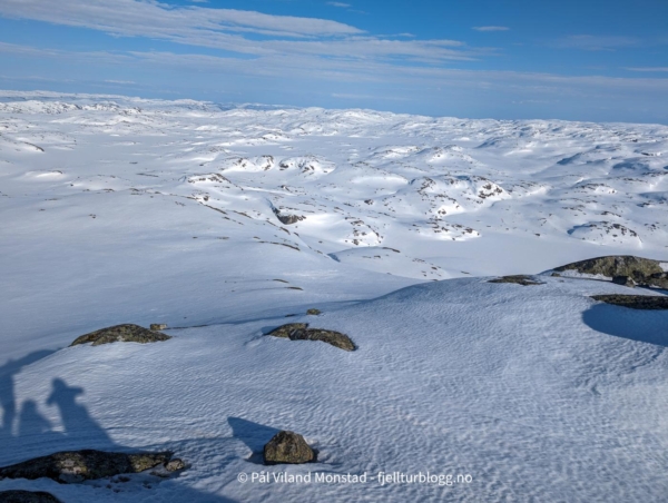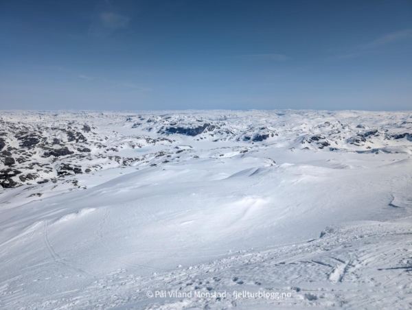 Etter pause, fotoseanse og tid til å nyte den storslagne utsikten, bar det unnabakke i sørøstlig retning fra toppen, i retning Midtvatnet og Steinkilenuten. Jeg har vært på Steinkilenuten 1440 moh på sommerstid (les om den turen her), og utsikten herfra er kanskje vel så imponerende som fra den høyere Snønuten. I øst rakk utsikten like til Gaustatoppen, og ellers langt inn i Telemark og Agder.